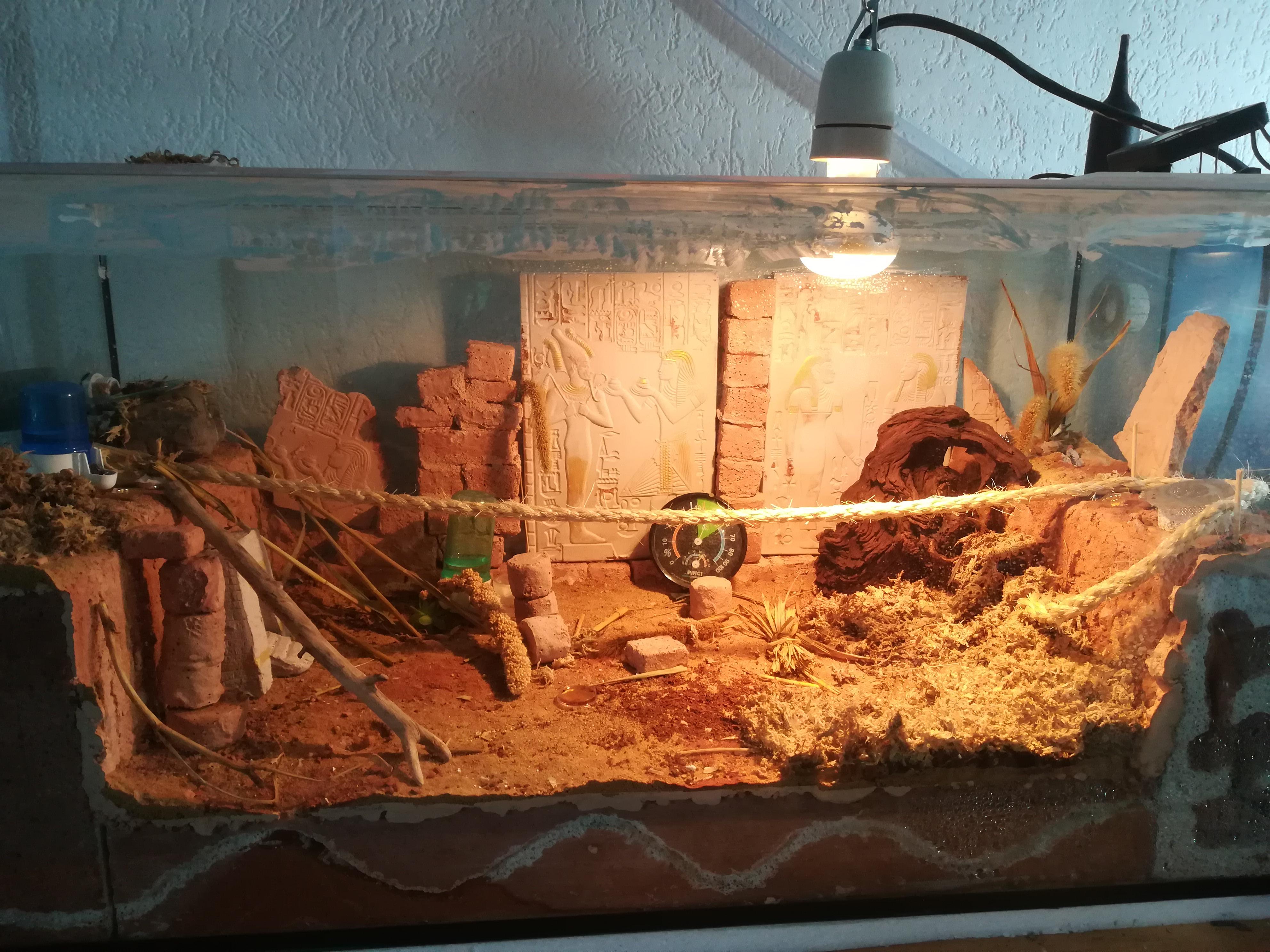 Also Becken gekauft (80 x 35x 40cm, Fressnapf, Aquarium), zwei BelĂŒftungslöcher jeweils rechts und links ins Glas gebohrt und mit Gaze verschlossen. Danach kamen drei Ytongsteine in die Mangel, zwei stehen rechts und links hoch im Becken, der andere liegt auf dem Boden und dient als Verbindungstunnel zwischen den zwei Nestbereichen. ( so etwa I____I )