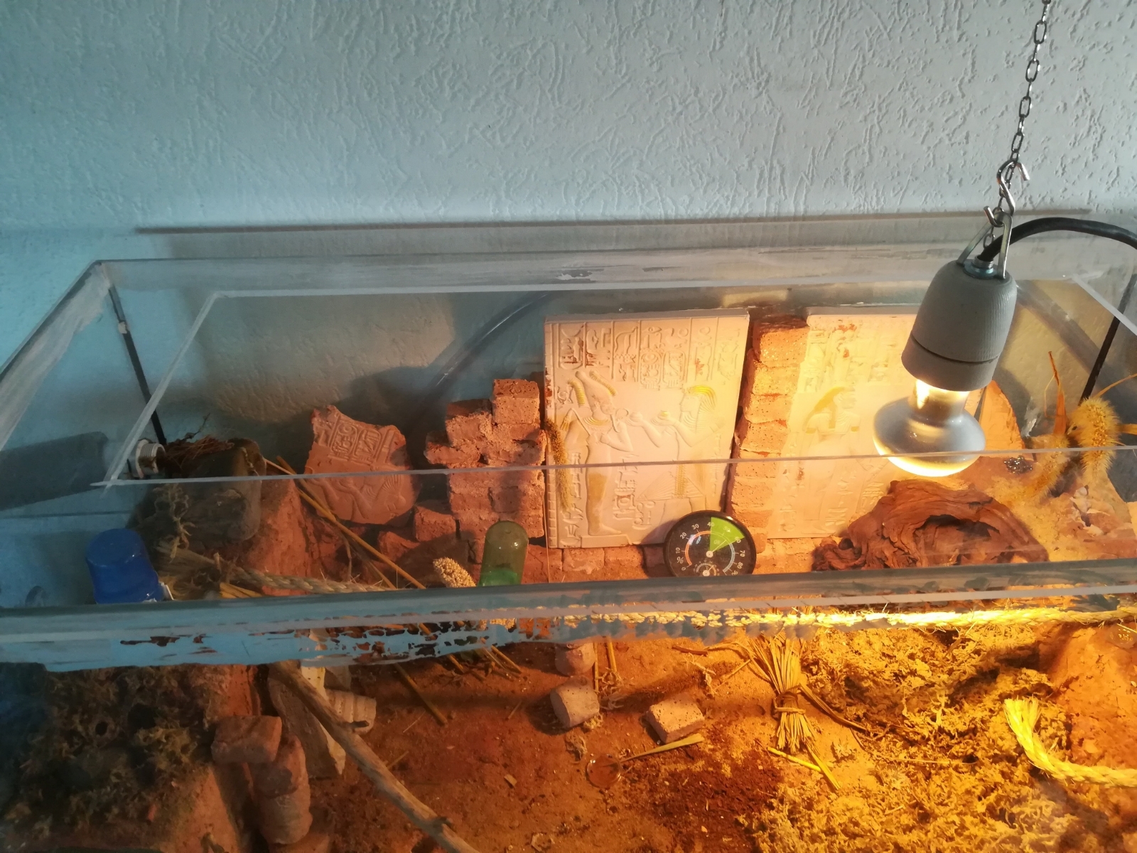 Eingerichtet wurde dieses Konstruckt mit trockenen GrÀsern, Sand-Lehm gemisch als BodenoberflÀche und etwas Sphagnum-Moos zum Spielen und bewÀssern.