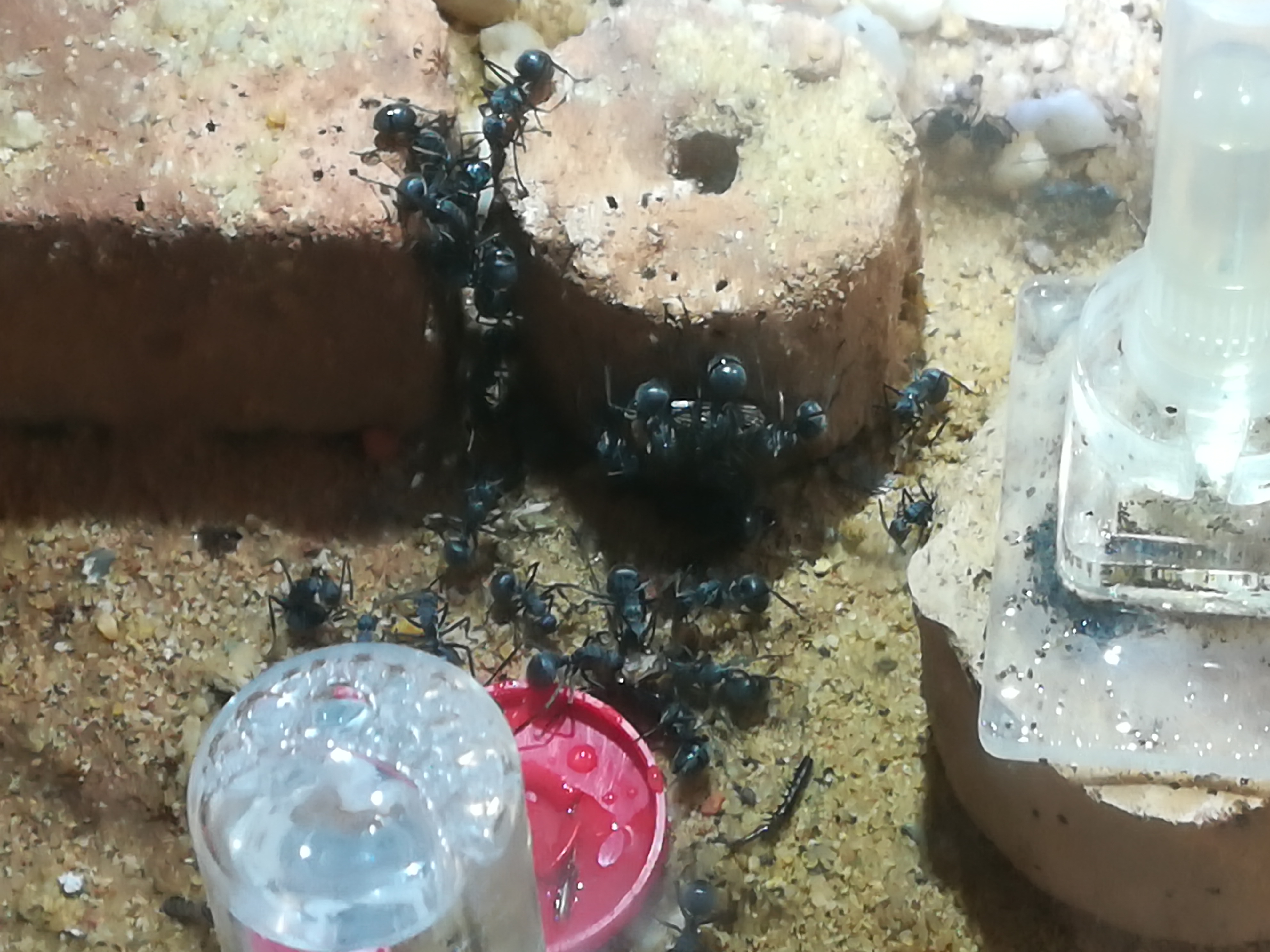 Wir legten das Röhrchen also ins vorbereitete WĂŒstenbecken (mit Ăgyptischem Touch) und in kĂŒrzester Zeit schwĂ€rmten Arbeiterinnen aus um die neue Heimat zu erkunden. Keine 2 Stunden nach Einsetzen der Kolonie begannen diese mit dem Umzug ins Ytongnest. Selbst die