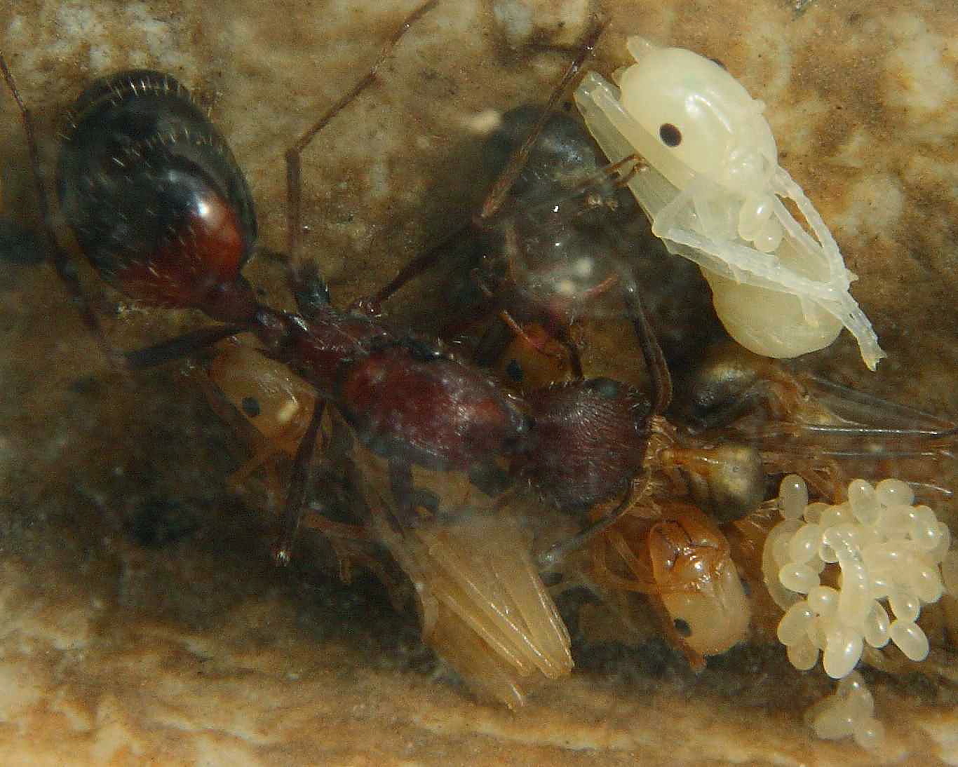Der Wassertank war ausgelaufen und nur im Bereich des Geflechtsstopfen, der kein Wasser anzog, konnten die Ameisen ihren Nachwuchs überlebensfähig lagern.