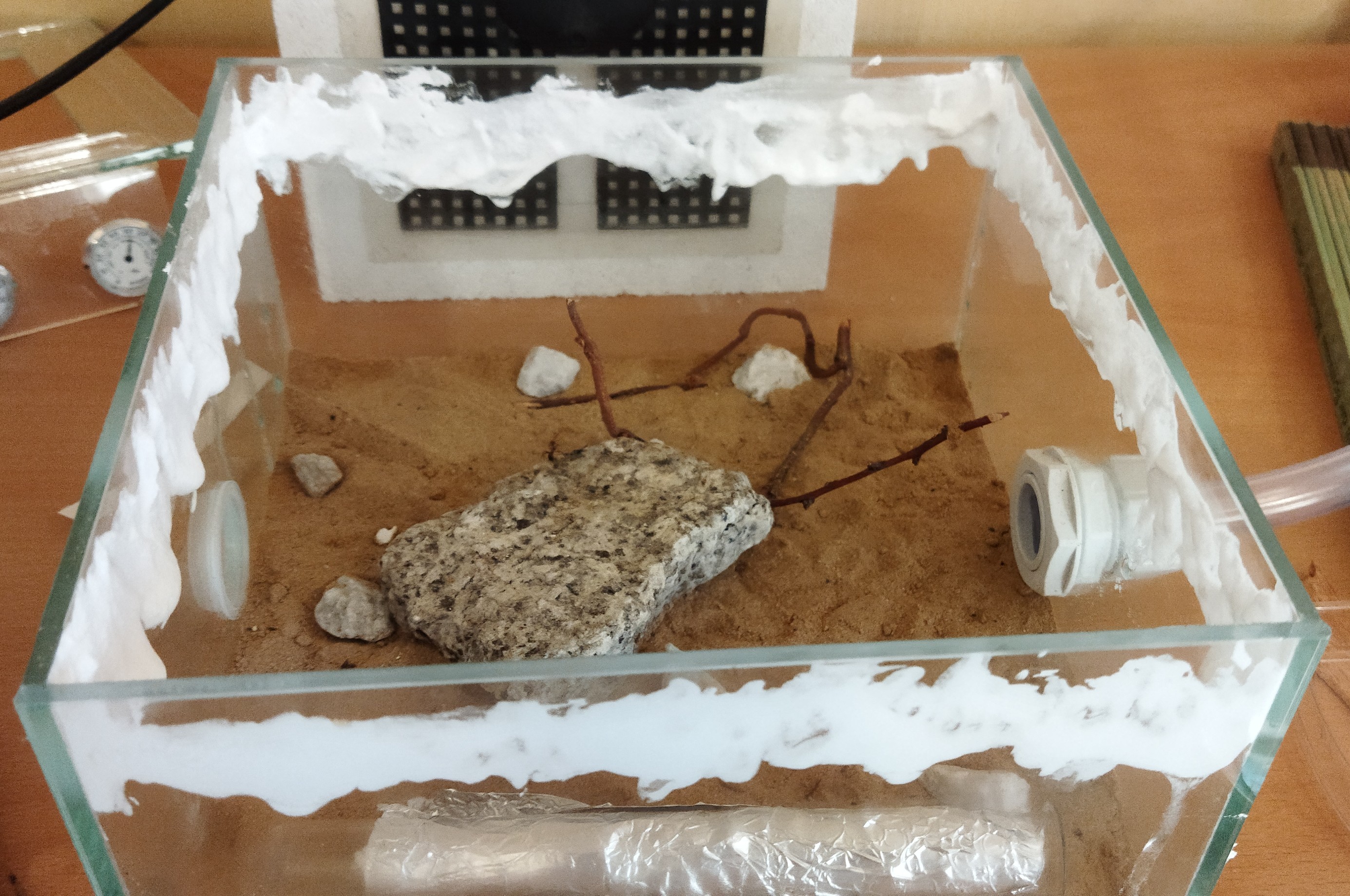 Die Temperatur in der Arena befindet sich momentan bei ca. 23 Grad, im Nest wird das sehr Àhnlich sein. Luftfeuchtigkeit ist in der Arena noch ein wenig zu hoch (60-65%) im (monatlich befeuchteten) Nest liegt sie bei schÀtzungsweise 70-80%.
