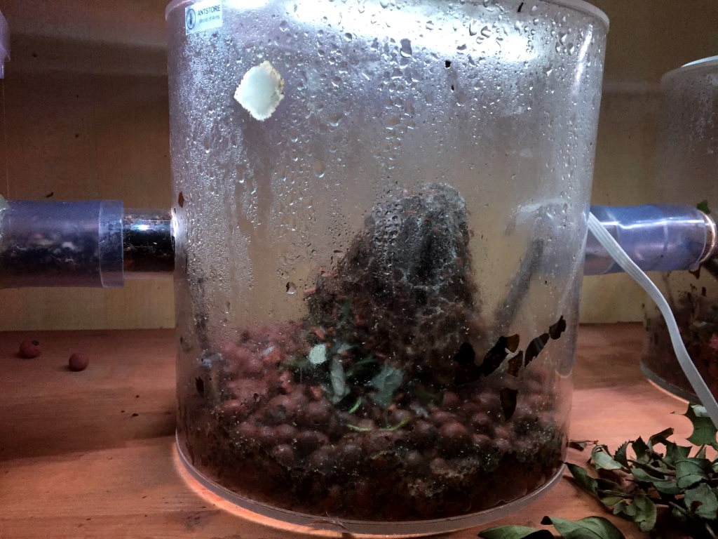 Hier hat sich auch ein Nachteil der Blähtonkugeln gezeigt: viele feuchte Hohlräume, welche einen super Lebensraum für Springschwänze darstellen. Zusammen mit den verrottenden Blättern + der hohen Luftfeuchtigkeit, war dies ein idealer Lebensraum für Springschwänze, die sich im Pilzbecken super vermehrt haben: