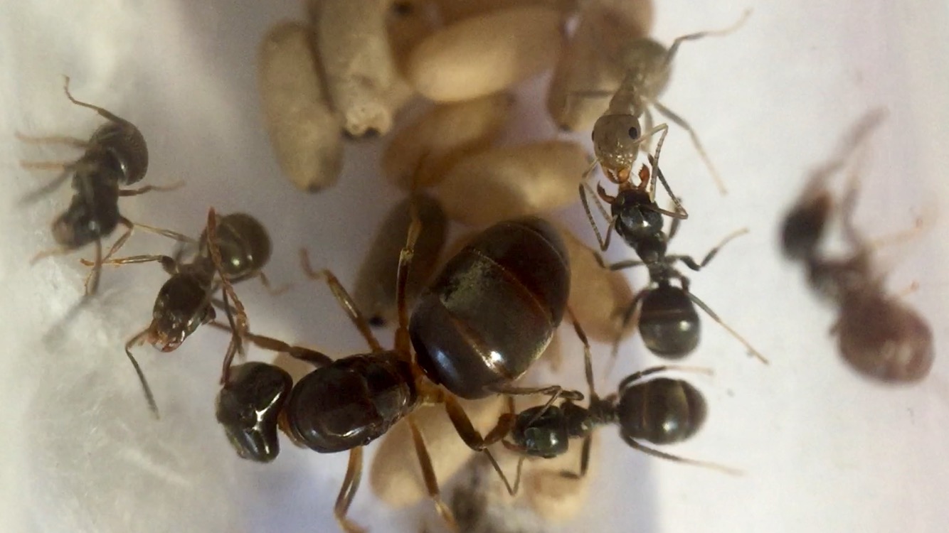 Sie lief direkt in das Nest der Wirtsarbeiterin, und diese verhielten sich erstaunlich friedlich. Eine der Arbeiterinnen verbiss sich zwar in ihrem Bein, doch der Rest zeigte keinerlei Aggression.
