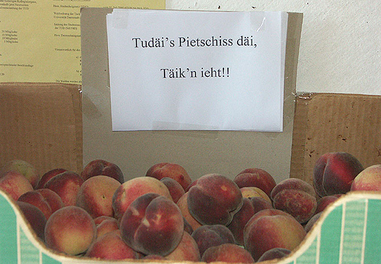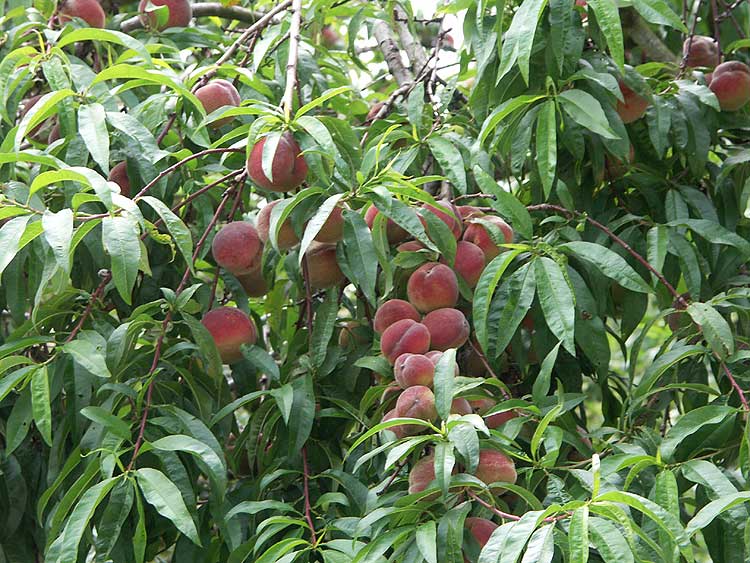 [font=Times New Roman]Die anhĂ€ngenden Bilder zeigen einen der PfirsichbĂ€ume im Juli 2004 (Bild 1). Nach Versorgung von Verwandten, Nachbarn und Bekannten war noch immer so viel Überschuss, dass ich an meiner Dienststelle im Flur eine Futterkrippe aufstellte (Bild 2). Selbiges mit SĂŒĂŸ- und Sauerkirschen, Äpfeln und so weiter, ĂŒber Jahre. Die PfirsichbĂ€ume mussten alle gerodet werden, als dann auch noch die FrĂŒchte befallen wurden.[/font]