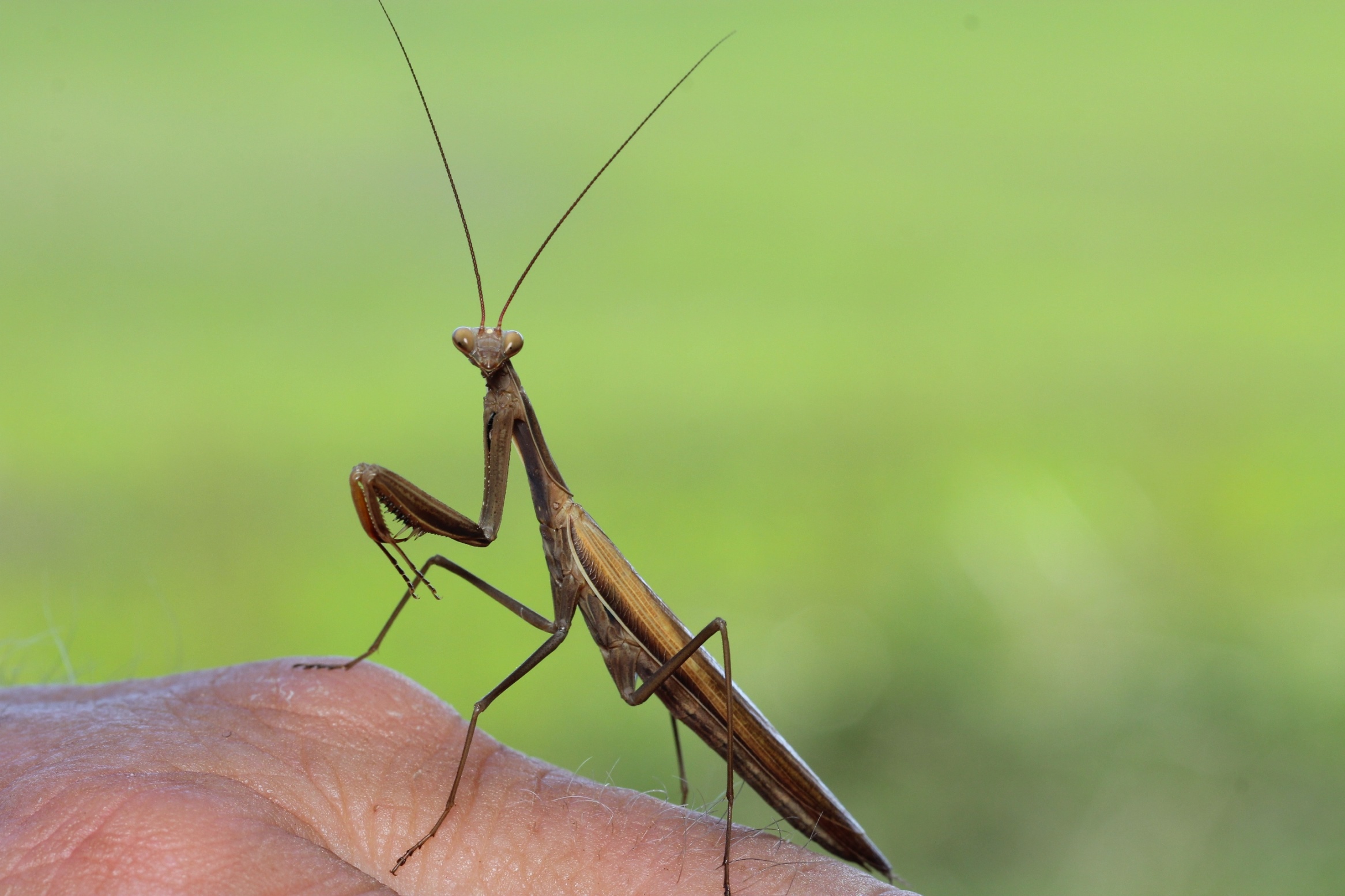 Vor 2 Tagen war ich in einem Revier, dass ich schon unzählige Male aufgesucht hatte. Ich fand dort alle möglichen Ameisen, z. B. auch mehrfach die seltene Strongylognathus testaceus, aber noch nie eine Gottesanbeterin. Ich stöbere also - wie immer - nach Ameisen, plötzlich sitzt eine Mantis auf meiner Hand, ein kleines Männchen. Es fühlte sich offenbar wohl in meiner Nähe und wollte garnicht mehr weg. Es hat mich neugierig beäugt. Zum Glück war der Hund weit weg und der Sohn für ein Foto nah!