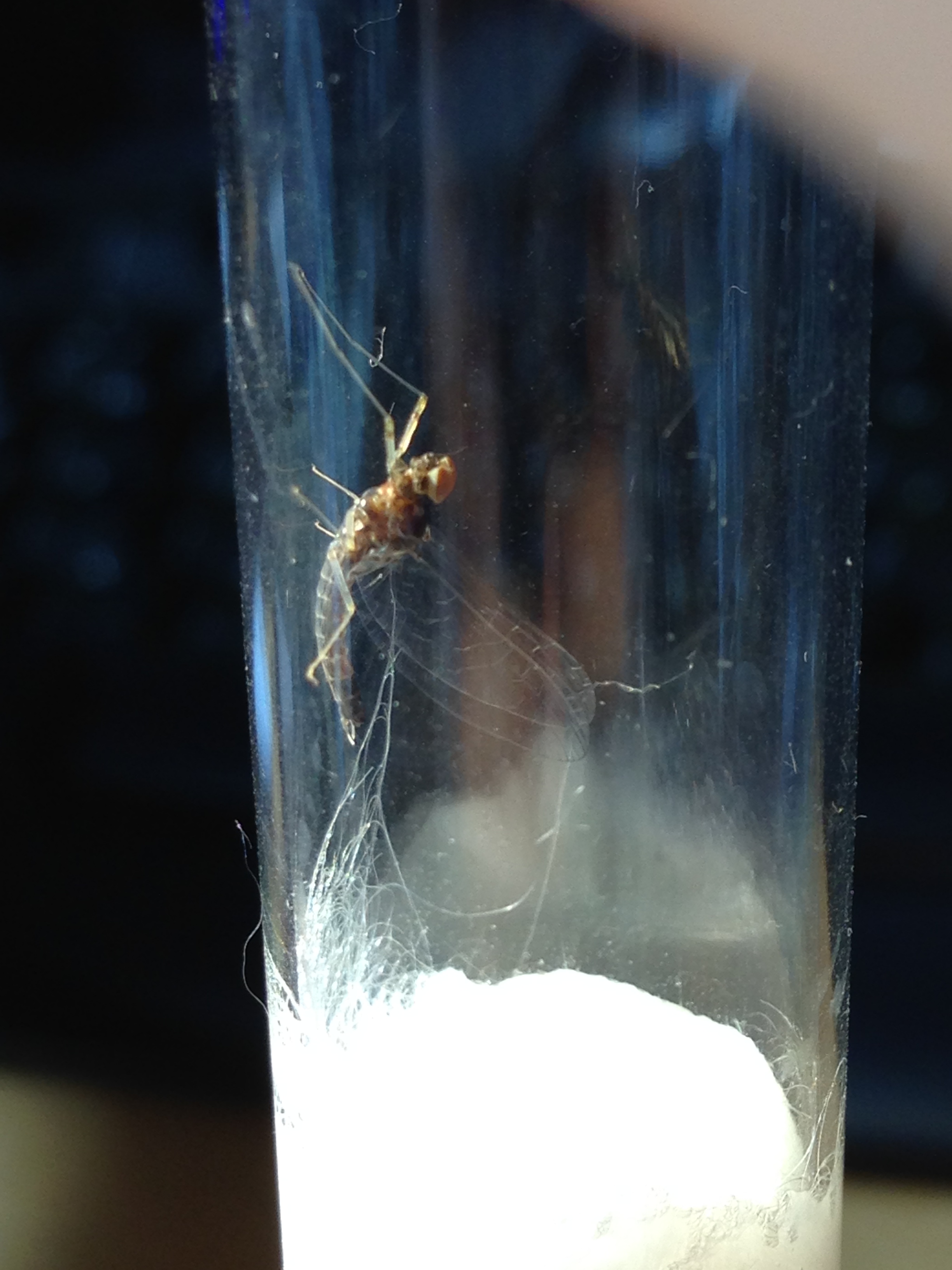 Es ist etwa 8 - 10 mm lang, grau-braun, einen nach oben gebogenen Hinterleib (am Hinterleibsende sind 2 lange Häärchen) und nach oben gerichtete rote Facettenaugen.