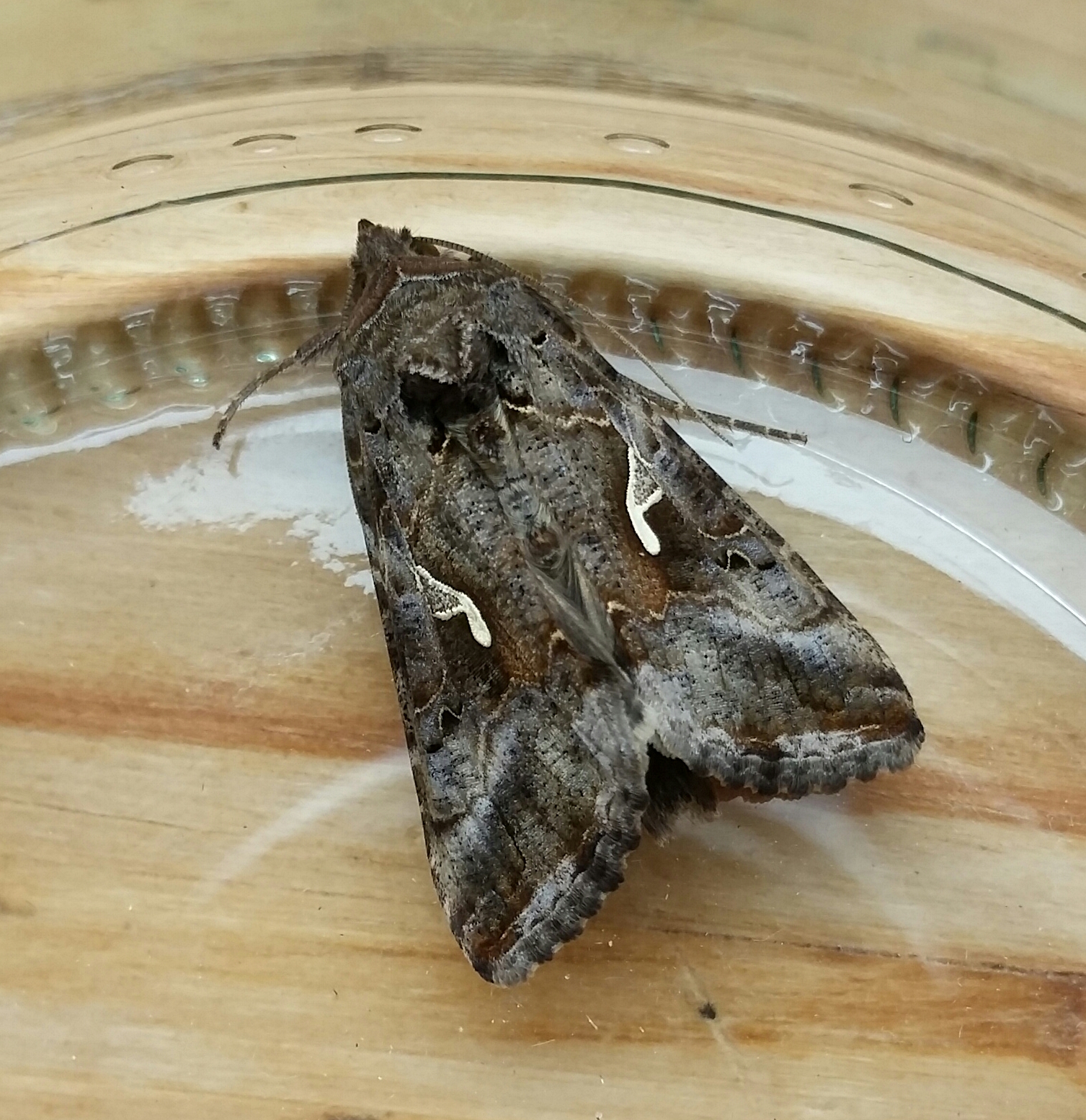 Mit Hilfe dieser Seite http://www.golddistel.de/nachtfalter/noctuidae/ wĂŒrde ich auf Autographa gamma tipppen.