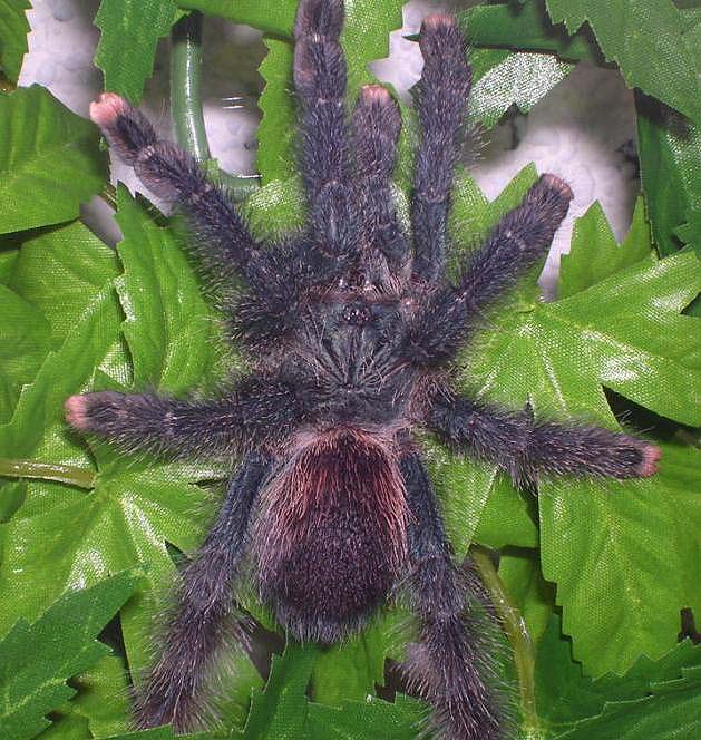 Avicularia metallica - eine der bekanntesten baumbewohnenden Arten, deren Weibchen eine KörperlĂ€nge von ca. 7cm erreichen. Viele lange Haare auf den GliedmaĂen verleihen dieser VS ein sehr buschiges und flauschiges Aussehen. Diese Spinnen glĂ€nzen metallisch blauschwarz, daher auch der wissenschaftliche Artenname. Ihre Tarsalklauen sind rosa abgesetzt. Die metallica braucht als Baumbewohner ein hohes Terri, dessen Boden stets feucht gehalten wird (Luftfeuchtigkeit gute 90%), sowie Klettermöglichkeiten und Temperaturen um die 25°C.
