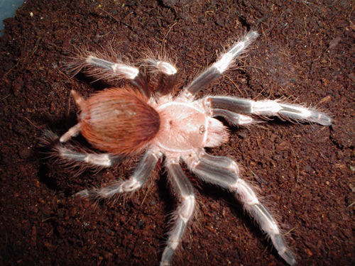 Grammostola rosea - Weibchen werden 6-7cm gross. Ihre Grundfarbe ist ein helles Braun. Ihr Hinterleib (Opisthosoma) ist mit rostroten Haaren ĂŒbersĂ€t und der Carpax ist rostrot gefĂ€rbt. Wenn diese VS noch sehr jung ist, bombardiert sie sehr gerne, was sich allerdings sehr schnell legt und sie bei Störung schnell die Flucht in Ihr Versteck ergreifen lĂ€sst. Diese Art ist fĂŒr lĂ€ngere Fresspausen sehr bekannt. Diese VS freut sich ĂŒber ein Terri mittlerer Grösse, verlangt allerdings einen etwa 10cm hoch eingefĂŒllten Bodengrund, da sie mit Vorliebe gerne grĂ€bt. Die Temperatur im Terri sollte bei ca. 25°C liegen.