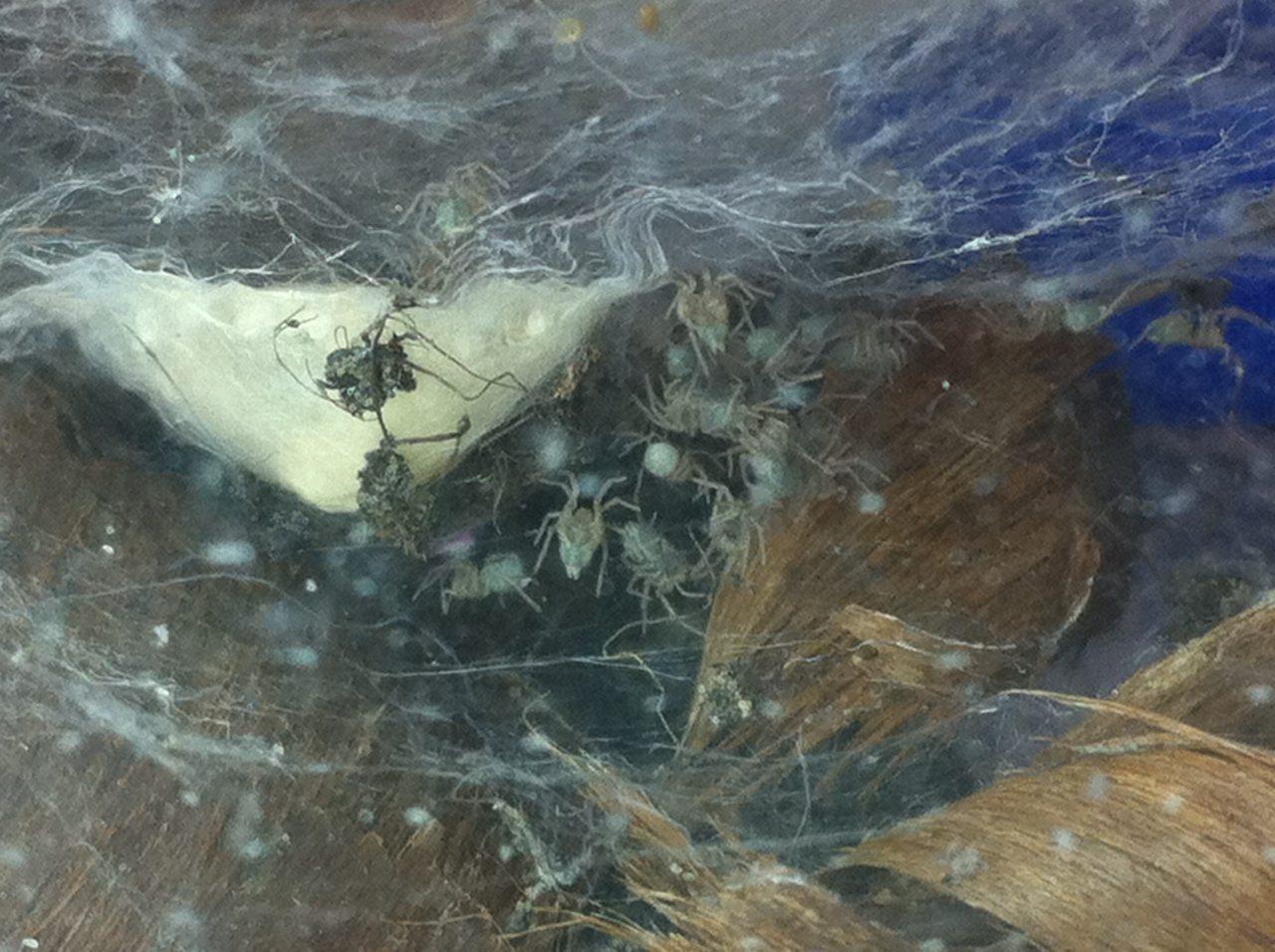 Die Winkelspinne hat merkwĂŒrdige Gebilde gebastelt. Es handelt sich um zwei dicke knubbelige SpinnenwebenknĂ€ule. An dem einen hat sie Erde befestigt. Das andere schwebt frei im Raum. Meine Vermutung (Hoffnung) ist, dass es sich um Eierpakete handelt.