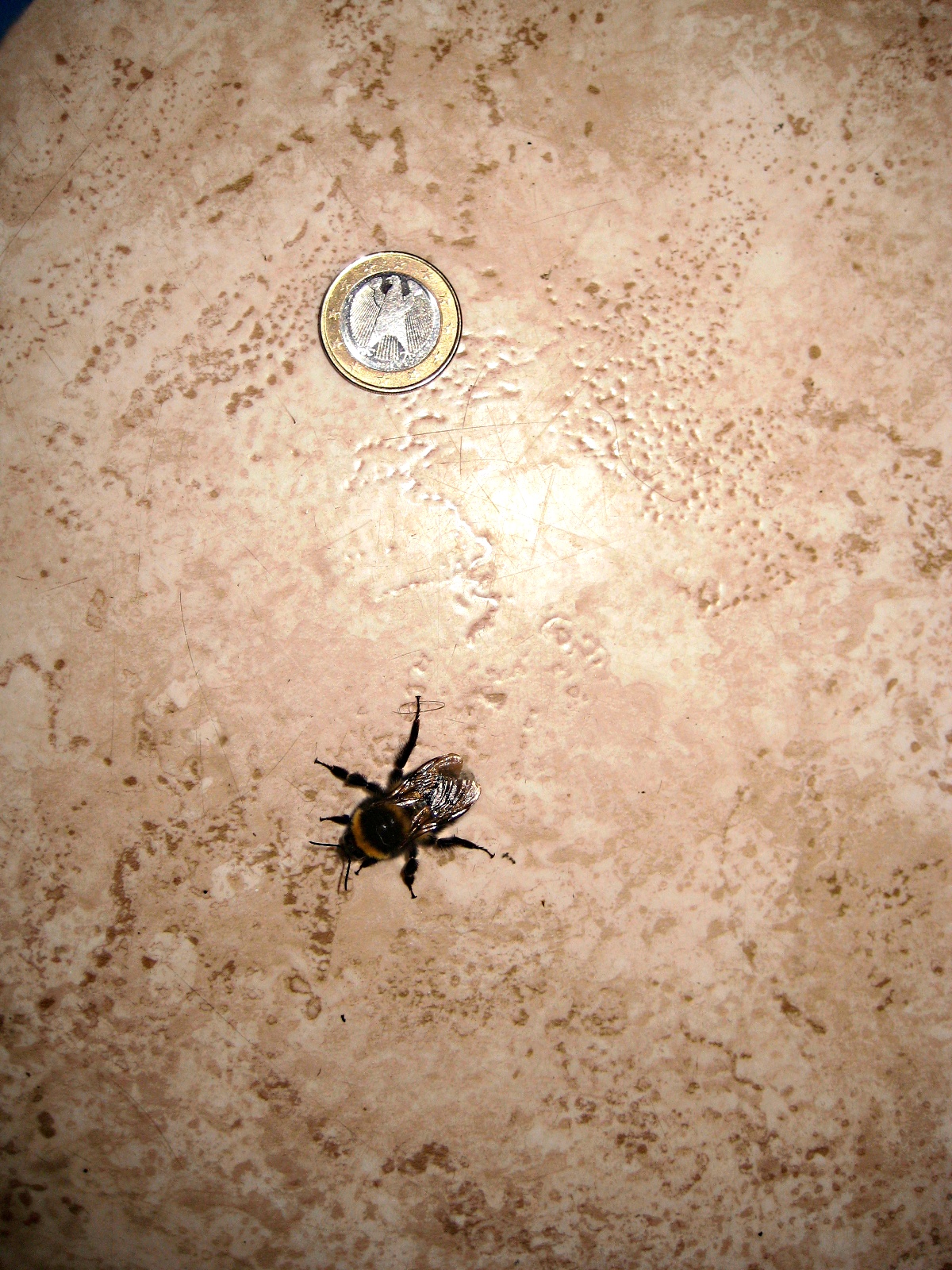 Die Fotos mit dem ein Euro Stück sind ein sehr schlechter Größenvergleich, die Hummel war Größer als es die Bilder vermitteln.