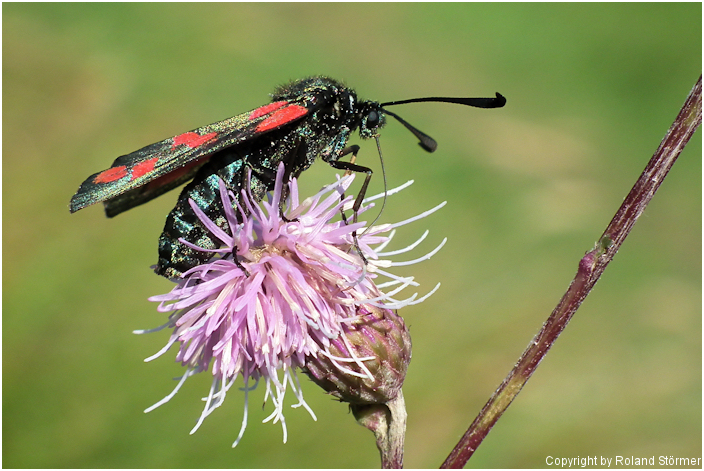 Es wird sich wohl um das Blutströpfchen (Zygaena filipendulae) handeln. Siehe hier: ->klick<-.