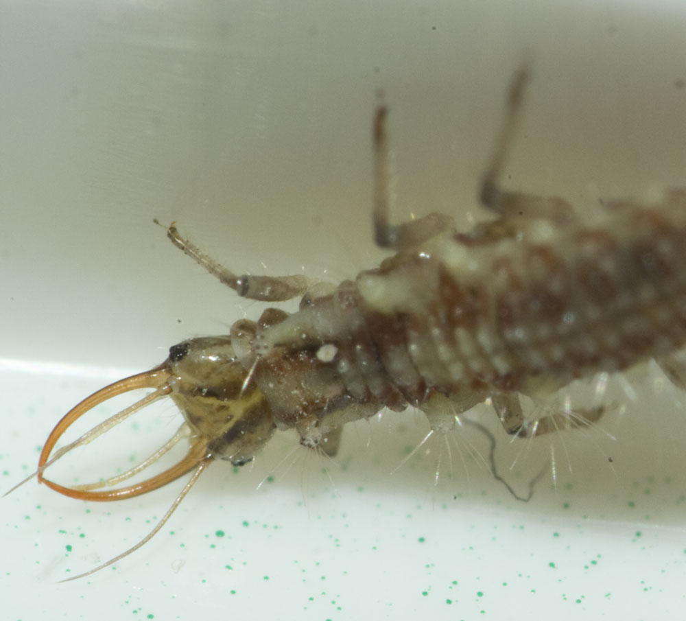 Die krÀftigen Zangen kennzeichnen die Larve als RÀuber (was SpringschwÀnze nicht sind) - dabei handelt es sich um eine Florfliegenlarve (oder eine nahe Verwandte).