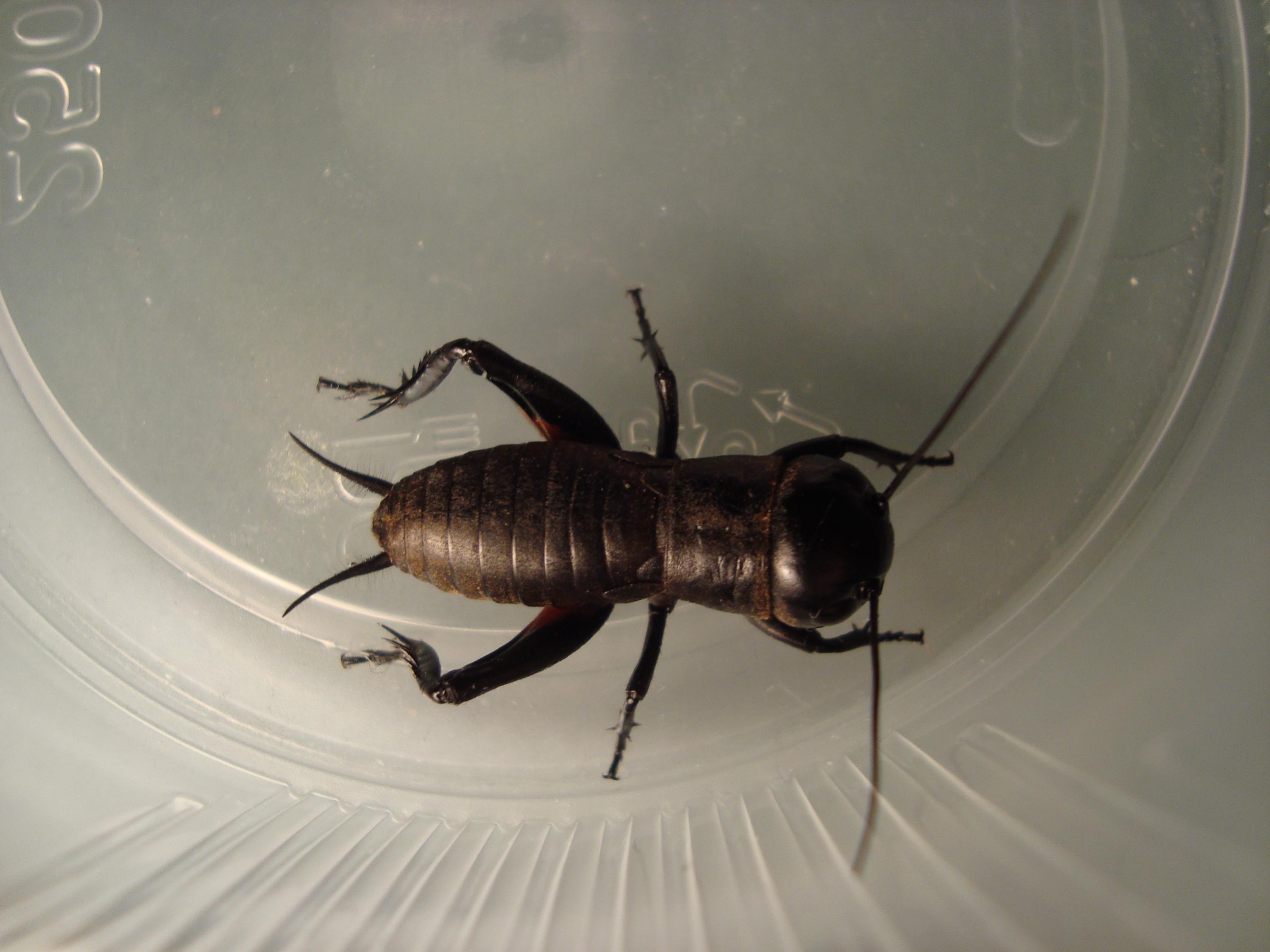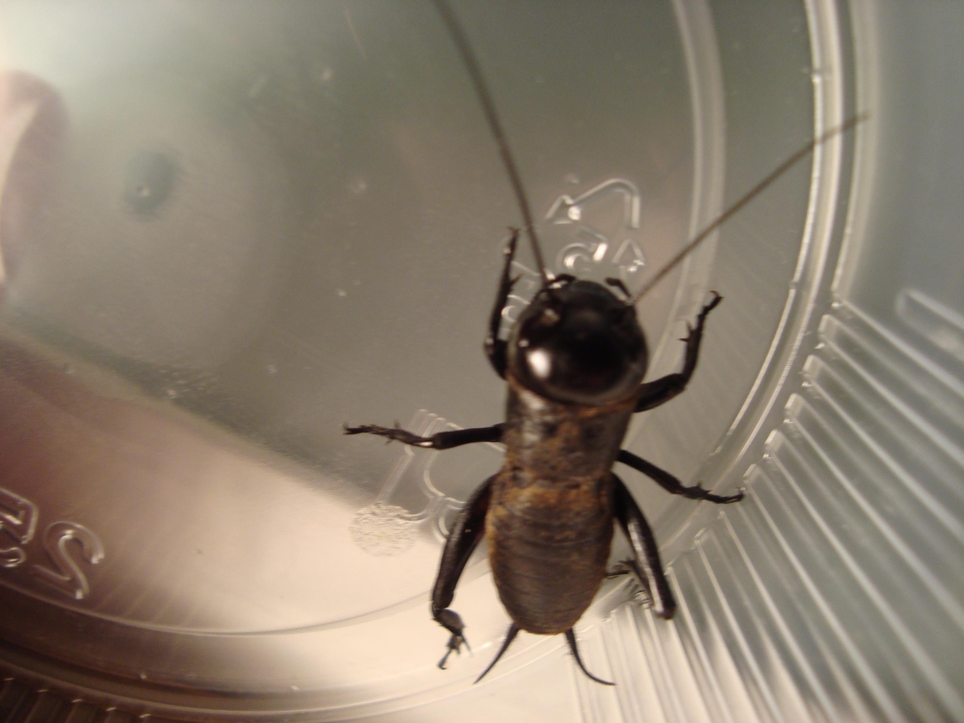 Das ist eine Feldgrille! Die ist wohl vor den kühlen Temperaturen in die Wärme geflüchtet und zum Fressen gäbe es da auch etwas. Ich denke, dass sie wie die Heimchen etwa Getreideprodukte frisst.