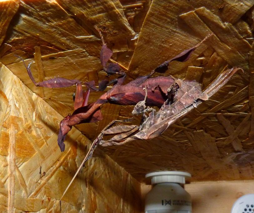 @Valli: Grundlagen der Mantidenhaltung findest du z.B. bei Mantisonline. P. paradoxa gehört zu den einfachen Arten. Im Prinzip reicht eine 20er-Plastikbox (5,8l Braplast-Dose) mit Lüftungsflächen und Fliegengaze im Deckel (immer sinnvoll bei Mantiden und Phasmiden zum Festhalten bei den Häutungen) und dünne Zweige oder eine Rolle Papierdraht als Einrichtung. Dann noch ein kleiner Halogenspot o.ä. von aussen drauf für erhöhte Zimmertemperatur und das war's eigentlich schon.