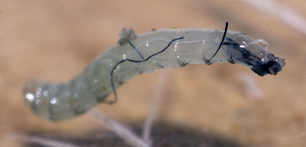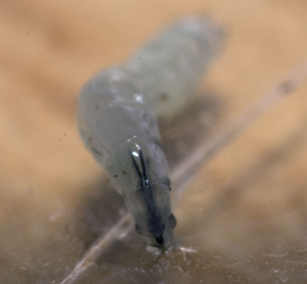Wie in Bild 2 und 3 schon zu erkennen war, zieht sich ein weißer "Faden" durch die ganze Larve. Handelt es sich dabei um das Nervensystem?