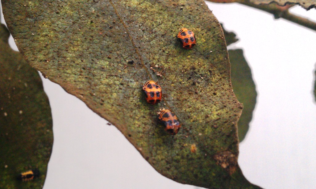 Alle drei sind Puppen . Ganz links unten ist - unscharf - eine Larve von Harmonia axyridis zu erkennen; die Farbverteilung ist typisch.