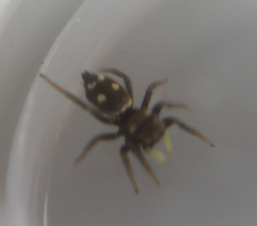 Die Spinne hat auffÀllig gelbe Fang"arme"(?) und eine fast Herzförmige Zeichnung auf der Unterseite. Auf der Oberseite ist das