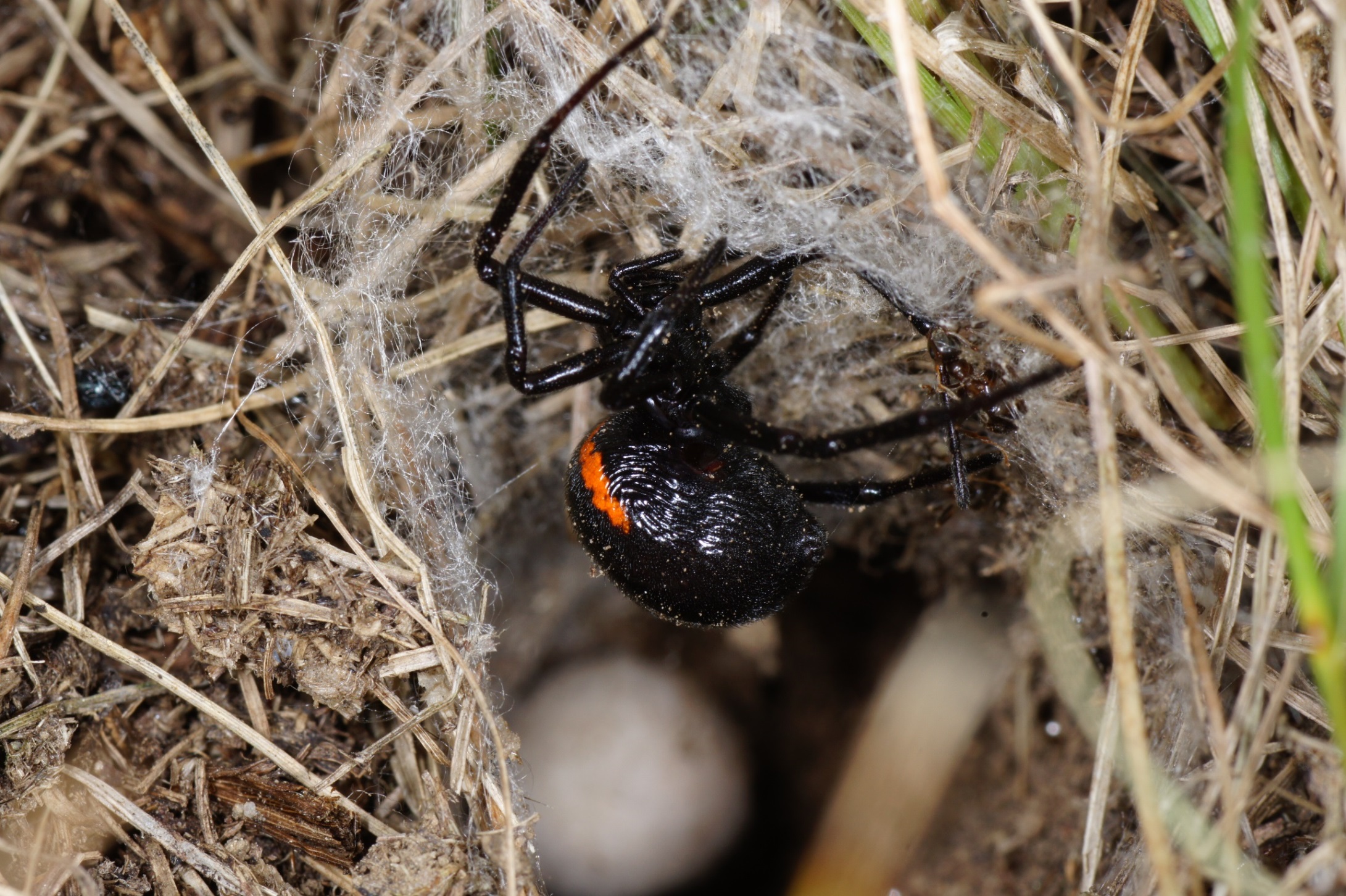 1. Als ich nach Ameisen suchte, habe ich unmittelbar neben der Spinne ein Nest v. Lasius s. str. aufgescheucht. Kurzfristig hat die Spinne daraufhin die Flucht ergriffen. Sie ist aber bald wieder zurückgekehrt und hat eine freche Ameise einfach in die Gespinstauskleidung der Röhre "geklebt" (sie ist am rechten Röhreneingang sichtbar).