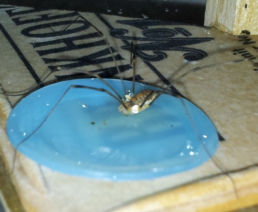 Bei einer solchen Aktion ist vor kurzem auch ein Weberknecht zu einem Bewohner des Beckens geworden. Er ist geschickt genug, den Ameisen auszuweichen, und ich habe vor, ihn frĂŒher oder spĂ€ter wieder nach drauĂen zu bringen, da das Klima im Becken möglicherweise etwas zu trocken fĂŒr ihn sein könnte, und das Nahrungsangebot zu spĂ€rlich. Als ich dann heute einen Blick in das Becken warf, machte ich eine interessante Beobachtung.