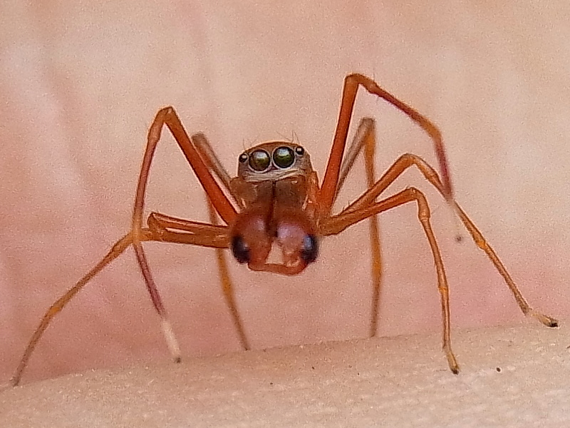Die Spinne hatte die meiste Zeit ihr erstes Beinpaar hoch erhoben, so daĂź es wunderbar die FĂĽhler der Ameisen nachahmte.