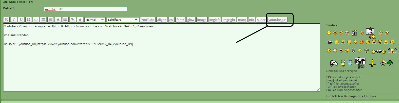 Beispiel: "[" youtube_url]https://www.youtube.com/watch?v=KrF3eXm7_B4[/youtube_url "]"