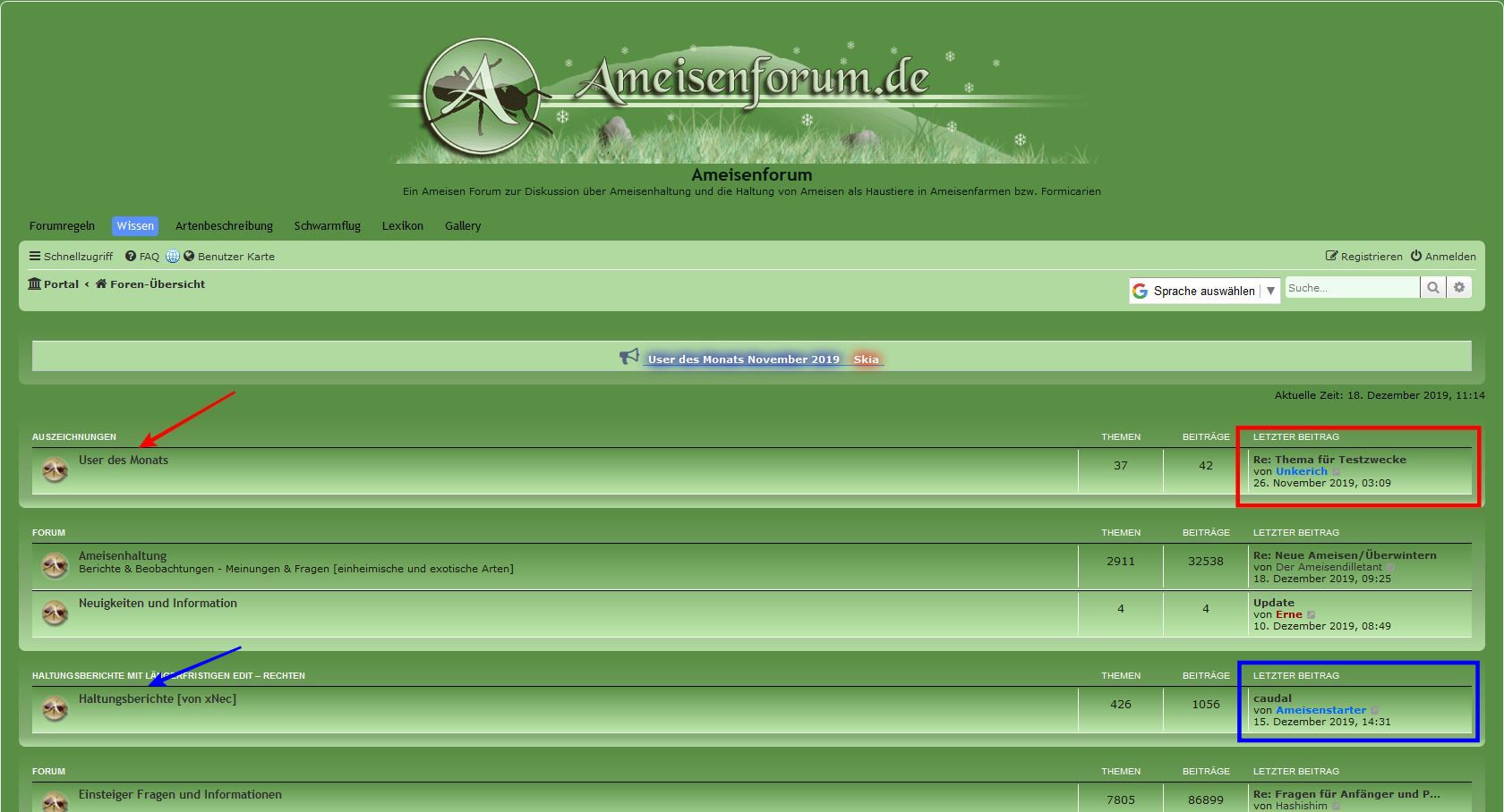 Auf der Startseite/ Foren-Übersicht wird unter dem Reiter Auszeichnungen bei User des Monats ein Beitrag von Unkerich angezeigt mit dem Betreff RE: Thema für Testzwecke. Klickt man auf den Beitrag gelangt man weder zu einem Beitrag von Unkerich noch zum User des Monats Thread. Ich denke mal, das ist etwas aus dem internen Bereich durcheinander gekommen. Ein ähnlicher Fehler tritt ein bisschen weiter unten bei einem Lexikoneintrag von Ameisenstarter auf, dieser ist in meinem Screenshot blau markiert.