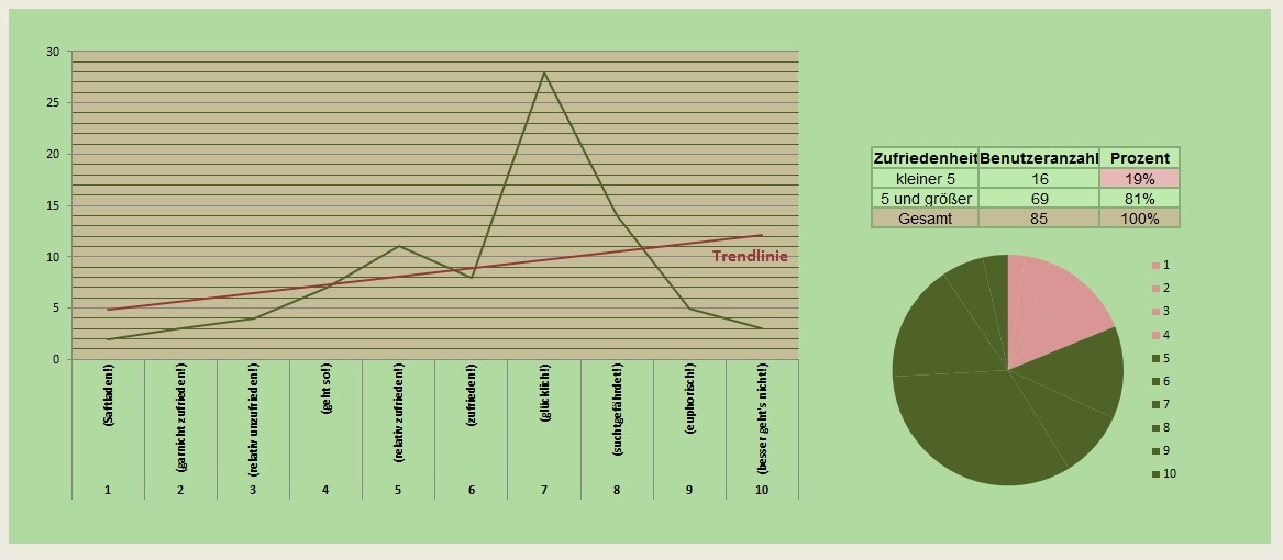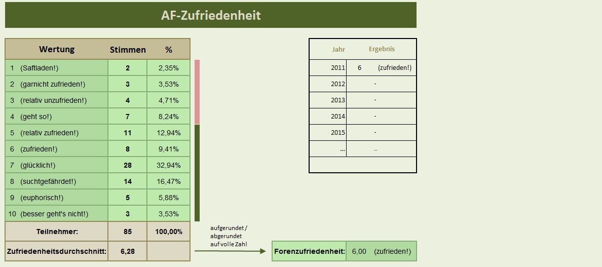 Die meisten User jedenfalls fühlen sich wohl im Forum und das ist das Wichtigste. Mir gefällt nur der Knick in unserer Auswertungs-Grafik (Grafik 1) nicht (wir haben 2 Hochpunkte), aber irgendwie wurde die Variante "6 - zufrieden" nicht allzu oft gewählt.