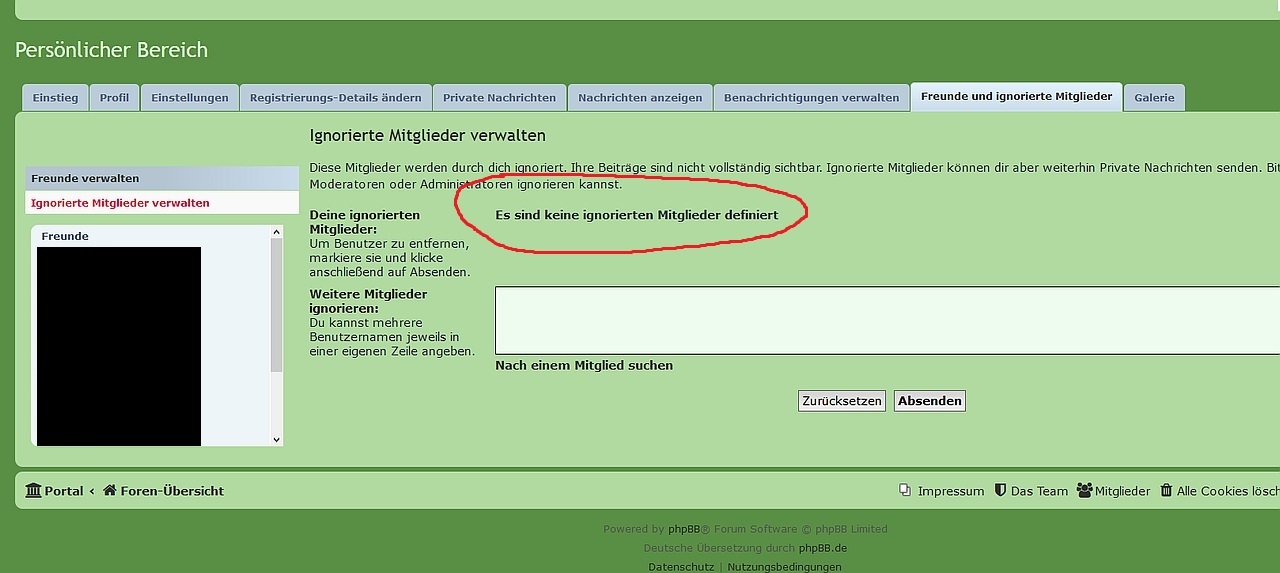 Ich habe versucht, Harry4Ant einfach eine Freundschaftseinladung zu schicken, das ist aber nicht möglich und ich bekomme folgende Meldung: Dabei ist meine Liste der ignorierten Mitglieder weiterhin leer: Ich habe versucht Harry manuell zu ignorieren, um ihn dann von der Liste zu nehmen, das funktioniert aber auch nicht, er taucht auf der Liste nicht auf, selbst wenn ich auf ignorieren drücke.