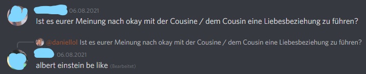 Selbst wenn die Frage nach Cousin und Cousine und einer Liebesbeziehung durchaus schon vorgekommen sein mag, würde ich mich a) nach der Rechtslage erkundigen b) jemand dessen Meinung ich schätze und der zu Verschwiegenheit neigt fragen und c) unter absolut keinen Umständen sowas in einem Discord/Forum erfragen.