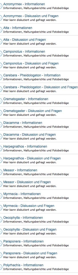 In Antforum und Antstore Ameisen Forum sind alle Blogs nach Typ sortiert. So sind beispielsweise alle Atta-Blogs unter Atta und alle Blogs über Camponutus sind unter der Überschrift Camponotus gelistet. So sind beispielsweise alle Blogs über Atta einfach zu finden.