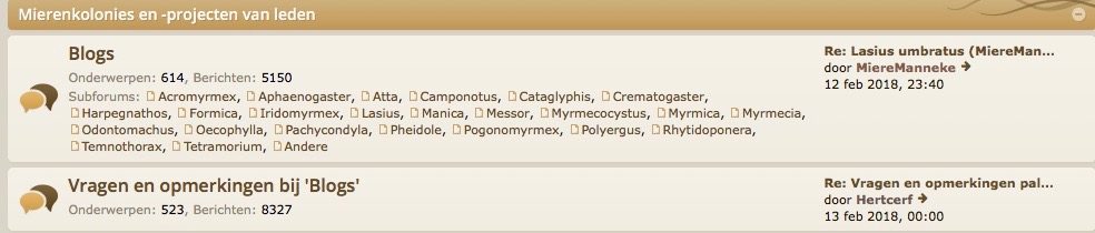 Op Antforum en op Antstore mierenforum staan alle blogs gesorteerd op soort. Dus bijvoorbeeld alle Atta blogs staan onder Atta en alle blogs over Camponutus staan bij elkaar onder de kop Camponotus. Daardoor zijn alle blogs bijvoorbeeld over Atta makkelijk te vinden.