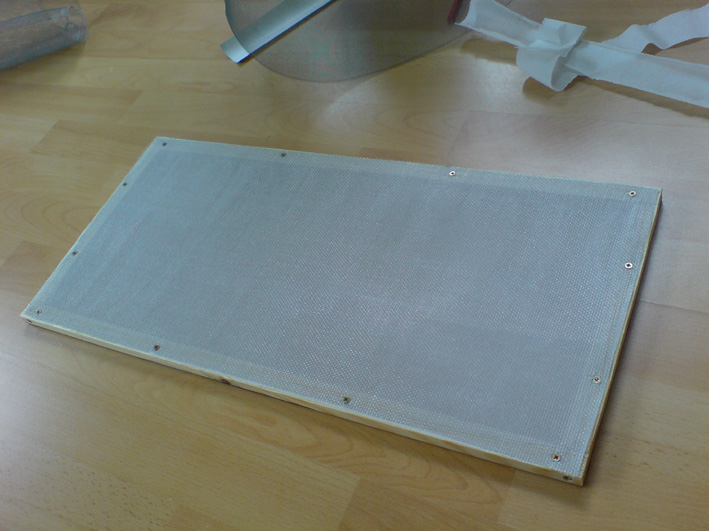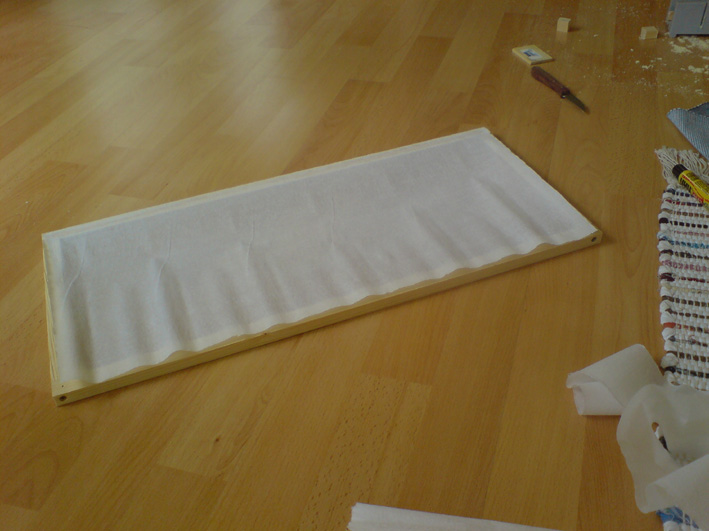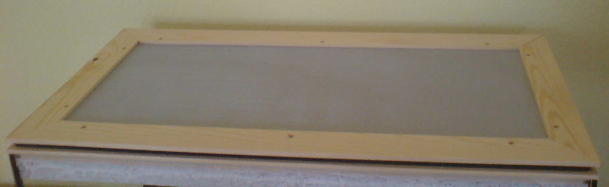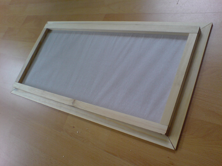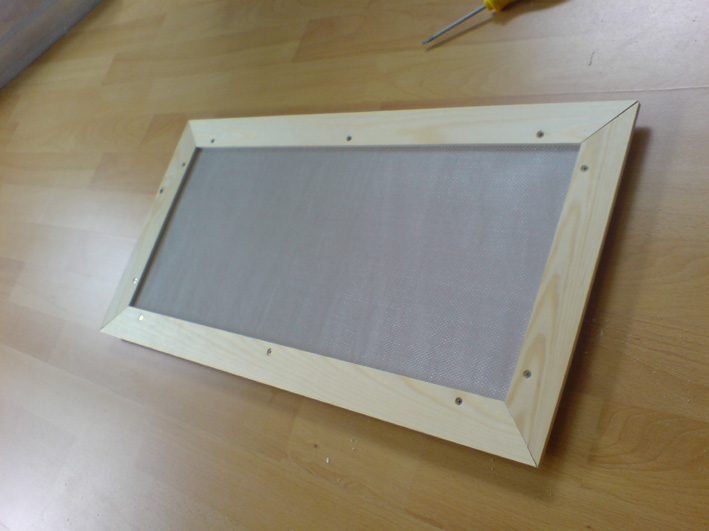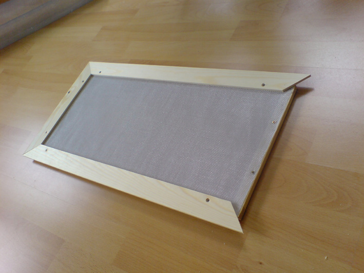 Der Deckel selbst besteht ebenfalls aus einem Holzrahmen, dort habe ich dann eine feinmaschige Drathgittergaze aufgezogen, sowie eine Schicht LuftdurchlÀssiges Bastelpapier ( der Optik von oben halber ). Darauf kamen dann Holzleisten, die ich in 45° Winkeln ansetzte.