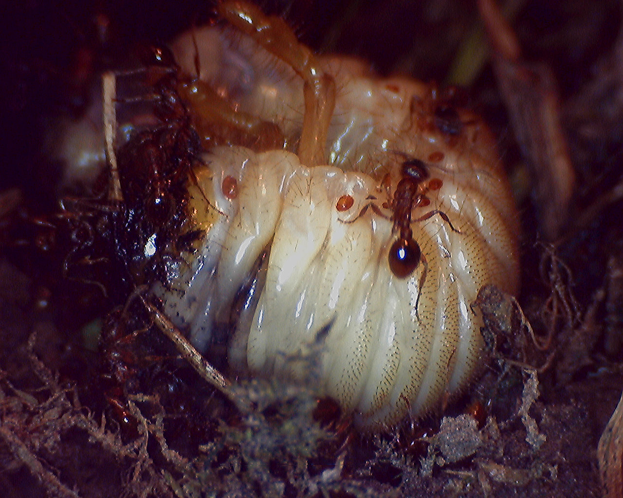 1. Myrmica cf ruba auf einem Engerling, 5-6 cm Entfernung