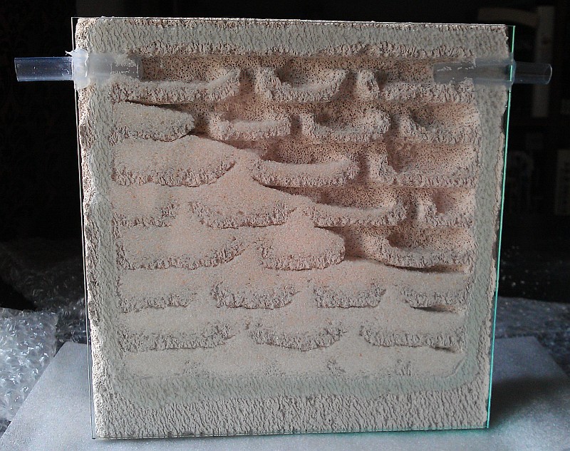 Die HĂ€lfte der Kammern ist mit gewaschenem Sand gefĂŒllt. Bisher habe ich damit nur gute Erfahrungen gemacht, der verklebt die Scheiben nicht und wird gerne herumgetragen. Einen Wassertank gibt es nicht, der (externe) Nestblock wird in einer Glasschale stehen und von unten bewĂ€ssert.