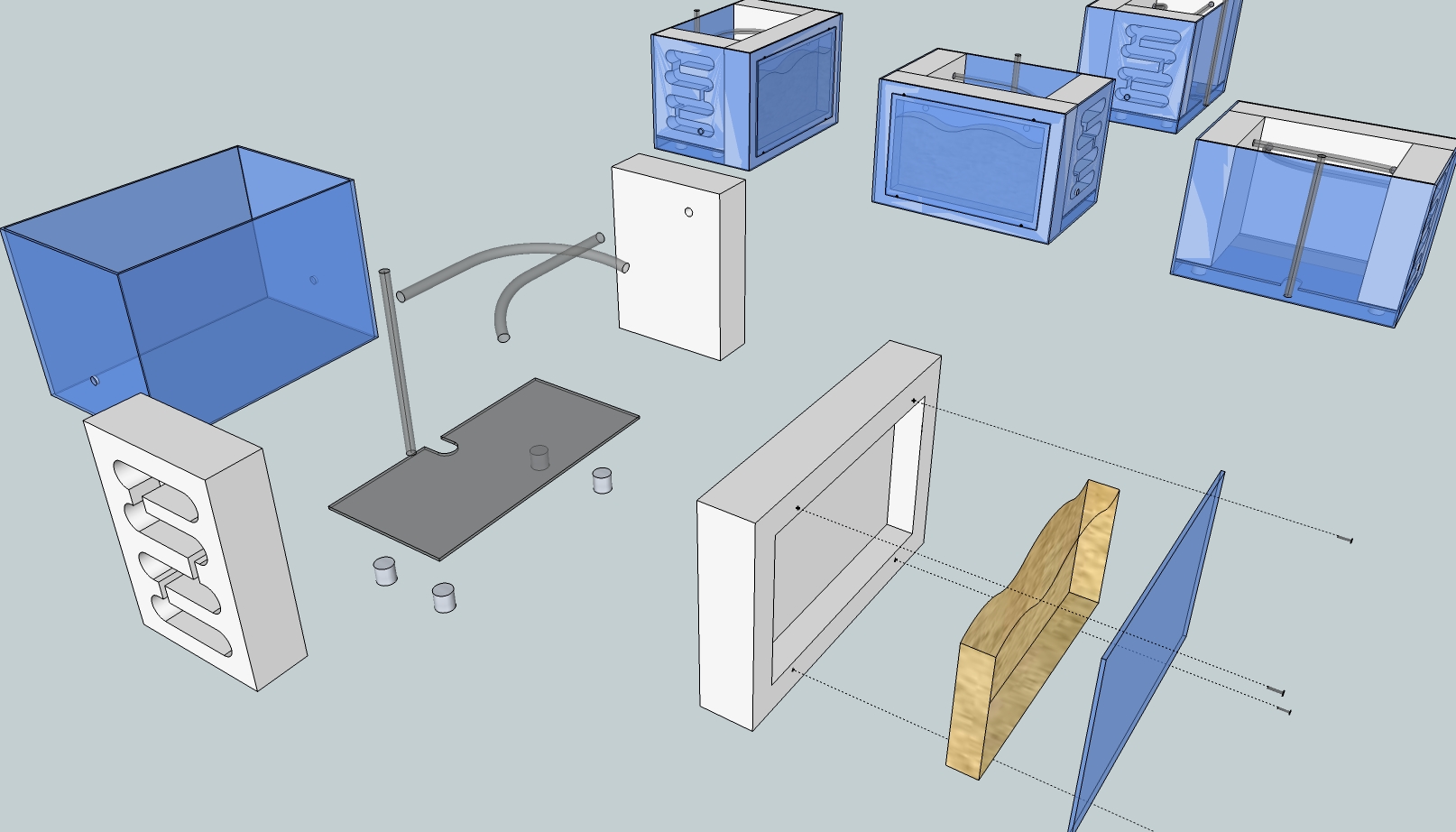 Statt dessen habe ich einen Rest einer alten Plexiglasscheibe genommen, welche gerade so ihren Zweck erfüllt. Die Aussparung für den Schlauch konnte ich mir auch sparen, da der Abstand zu Aquariumscheibe so groß ist, das ich bequem von oben rein gießen kann. Und statt der Metallrohre habe ich zwei alte Plastikschachteln verbaut, wobei ich mir nicht die Mühe gemacht habe, diese mit Heißkleber zu befestigen.