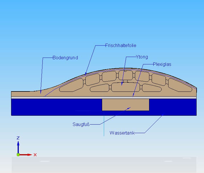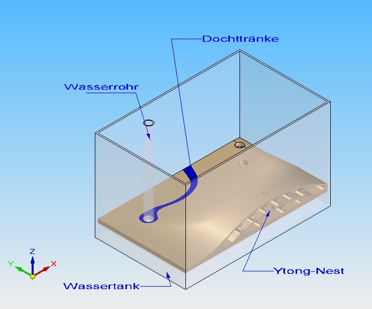 Im hinteren Bereich (blau) soll eine DochttrÀnke sein, die ebenfals von dem Wassertank versorgt wird.