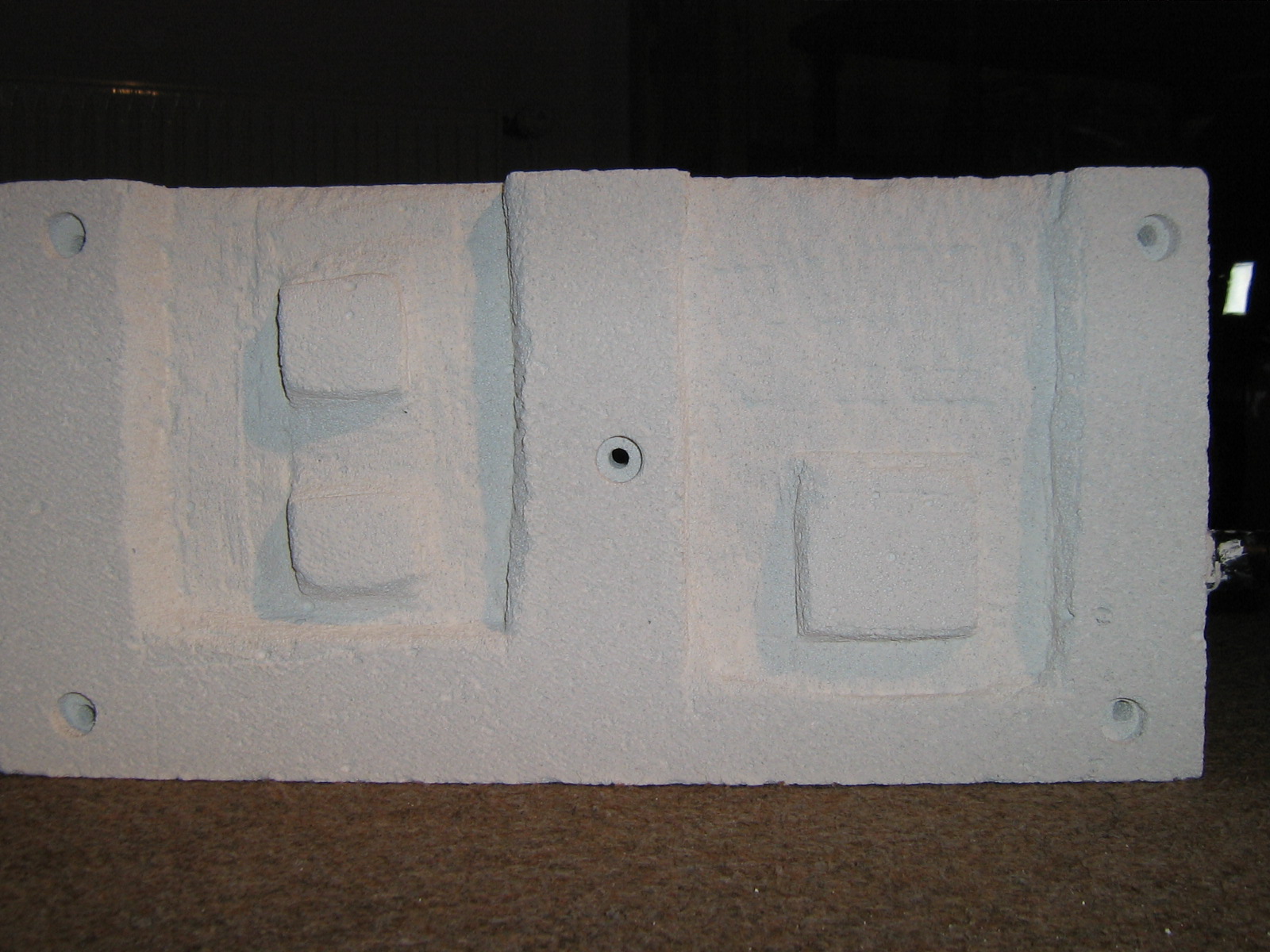 Bild 2: fertiges Nest von der Unterseite mit Bohrlöchern zur zwei Aussparungen für zwei Wasserbehältnisse und den Zapfen, die das Wasser aufsaugen (Kapillareffekt) und in das Substrat leiten