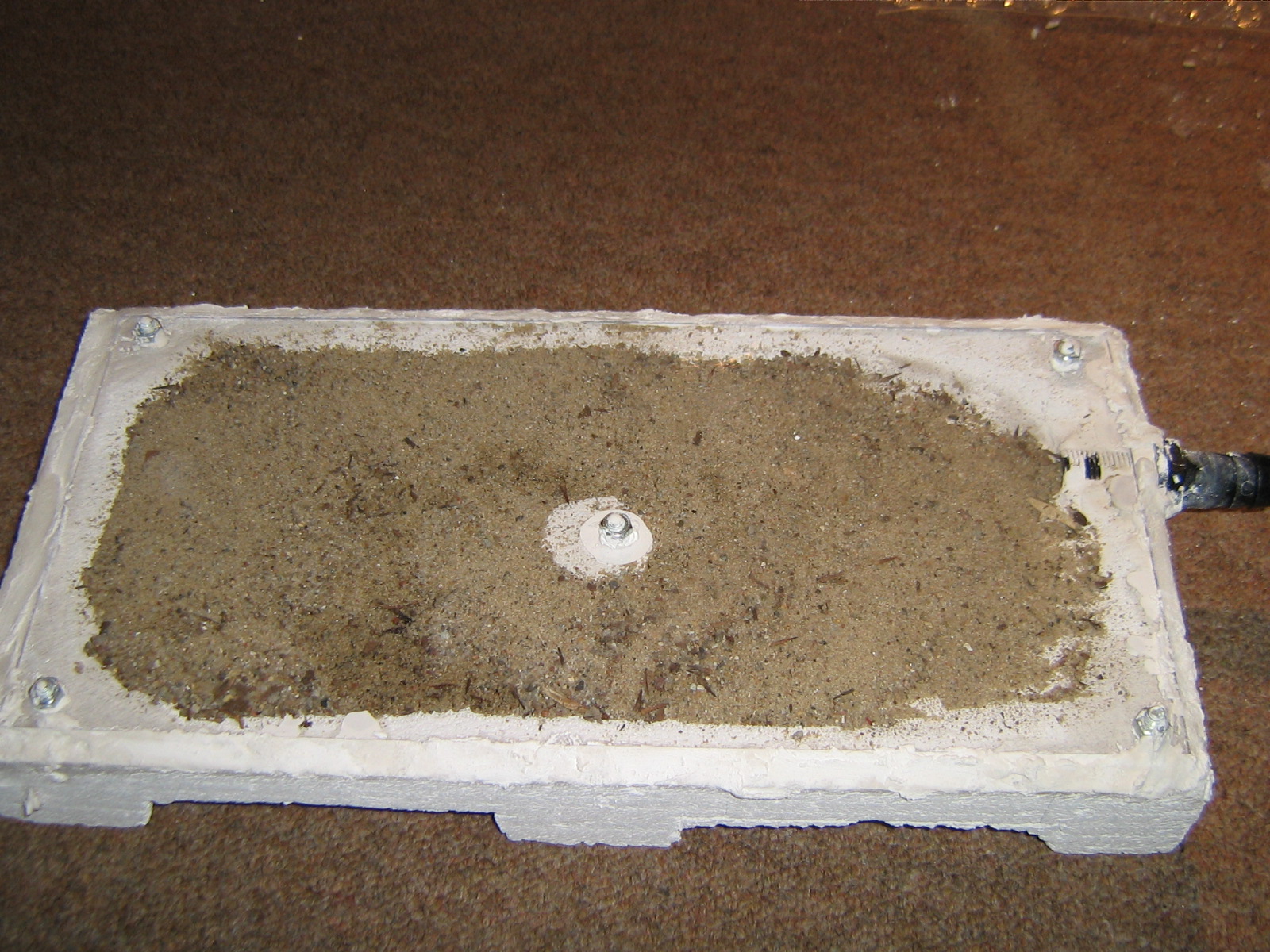 Bild 1: fertiges Nest mit aufgesetzter Scheibe, Sandfüllung und mit Gips versiegelten Löchern und Ritzen