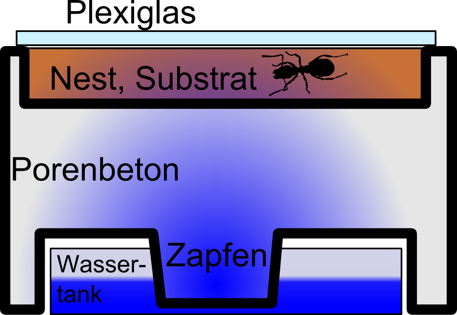 Für das Ameisenwohl gibt es ein freigestaltbares Nest. Wahrscheinlich werden sie sich hauptsächlich im feuchteren Nestteil aufhalten (auf Höhe der Zapfen, die das Wasser befördern), aber abhängig vom Substrat können sie recht frei bauen.