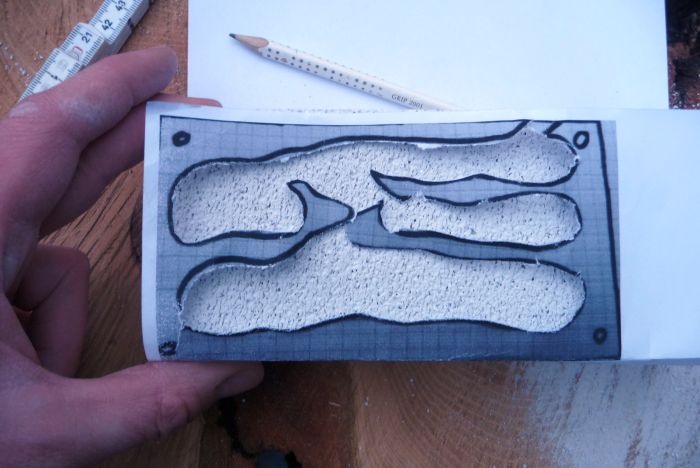 Dann schnitt ich eine Schablone aus und übertrug alles auf den Block, was ganz gut klappte, solange ich mit dem Finger das Papier genau dort festdrückte, wo ich anzeichnen wollte.