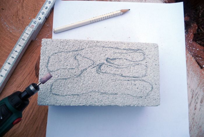 Anfangs verrutschte die Schablone noch. Später aber nicht mehr. Gänge und Kammern schliff ich mit dem Lidl-Dremel aus dem Block heraus. Mit dem genutzten Schleifaufsatz ließ sich gut arbeiten. Nicht zu viel, auch nicht zu wenig Abtrag. Am Ende war er allerdings stumpf. Ein weiterer Vorteil: Die Länge des Aufsatzes passte ganz gut zur geplanten Gang- und Kammertiefe. So konnte ich mich gut orientieren und fräste nicht zu tief.
