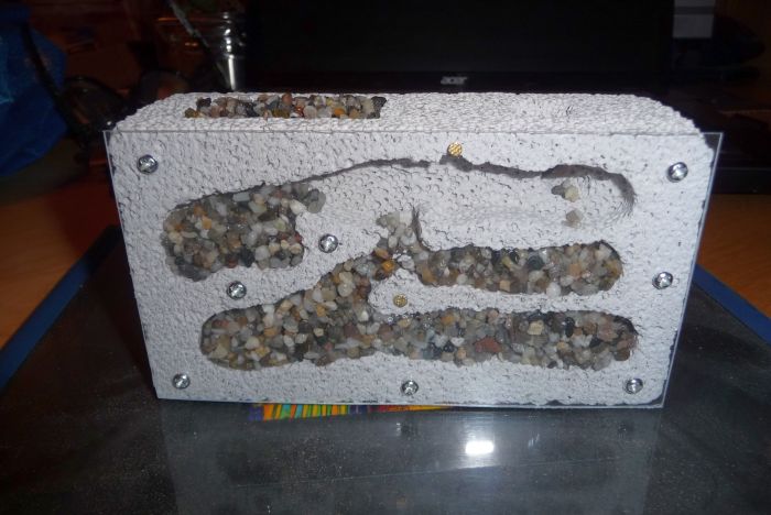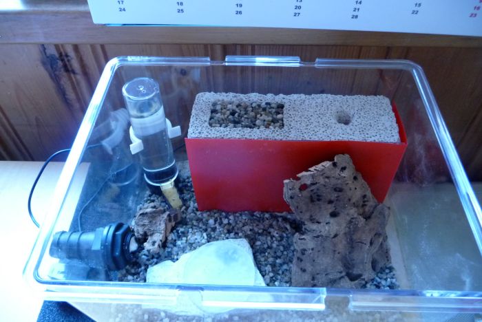Durch die geringe Stärke der Platte waren viele Schrauben (und Nägel, wo die Schraube zu dick gewesen wäre) nötig. Die Kammern befüllte ich mit gründlich abgekochtem Aquarienkies. F. sanguinea kann diesen gut bewegen.