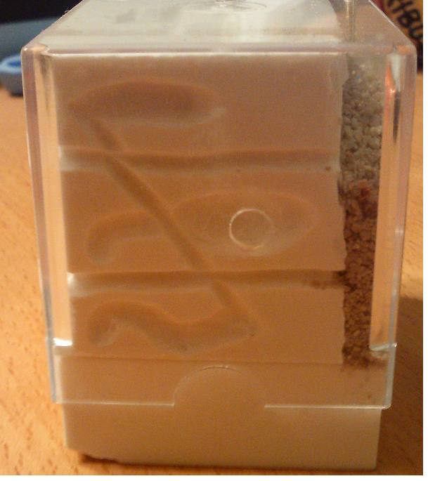 Seite 2: 4x5 cm, sehr schmale kleine Kammern fĂŒr eine sehr kleine Ameise. Verbunden mit Farm und Seite 1. Hier liegt einer der beiden AusgĂ€nge. Ein schmales SchlauchstĂŒck lĂ€sst sich gerade so einstecken.