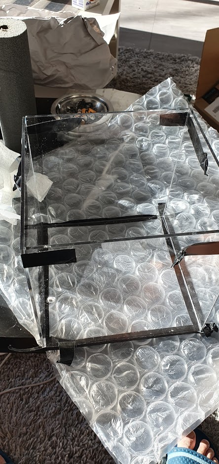Dann habe ich die Außenscheiben erstmal mit Isolierband fixiert und dann die Kanten mit Silikon ausgepritzt , dabei ein kleiner Tipp ,nehmt Wasser mit Spüli gemischt ,taucht eure Finger ein und dann könnt ihr sehr gut das überschüssige Silikon entfernen und die Silikonfugen schön glätten für eine gute Optik