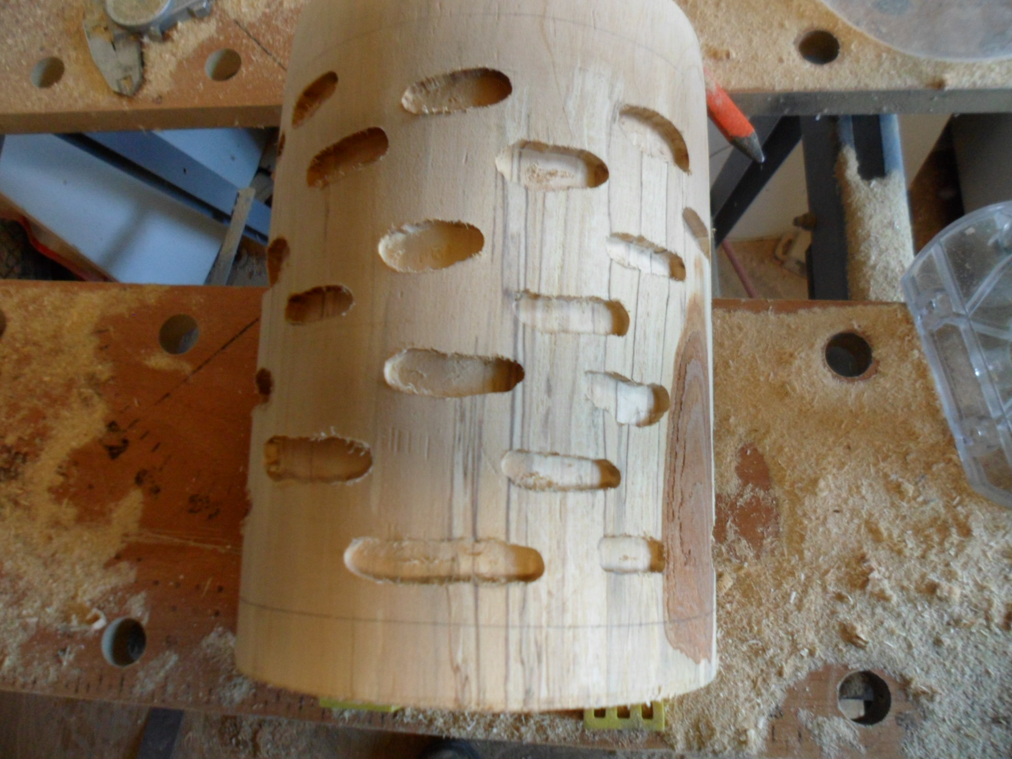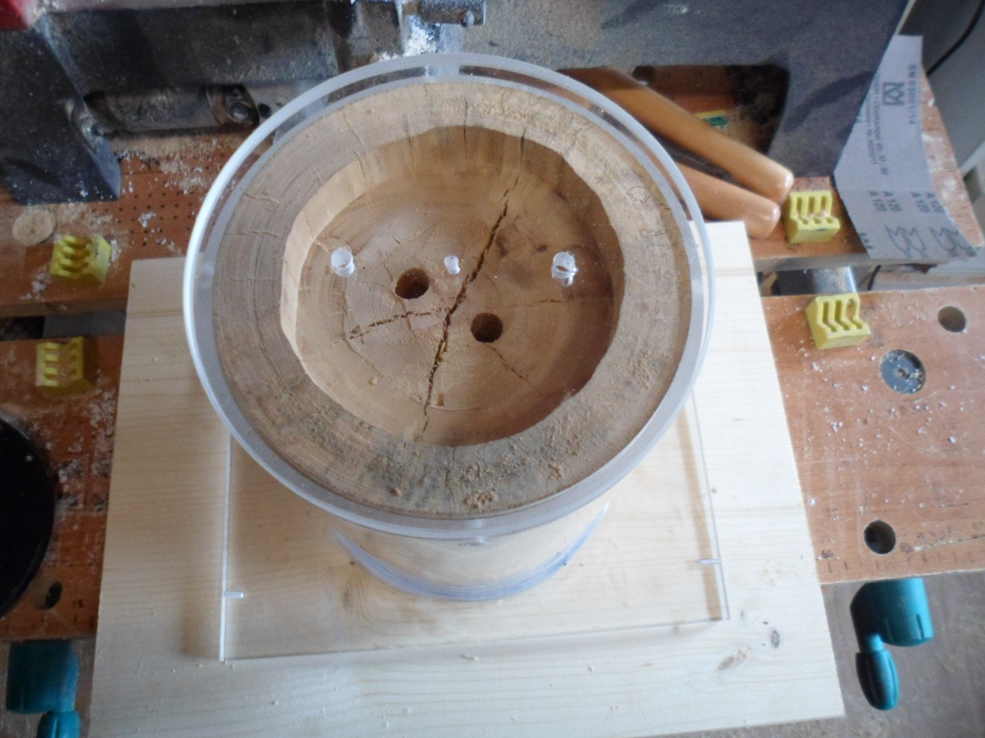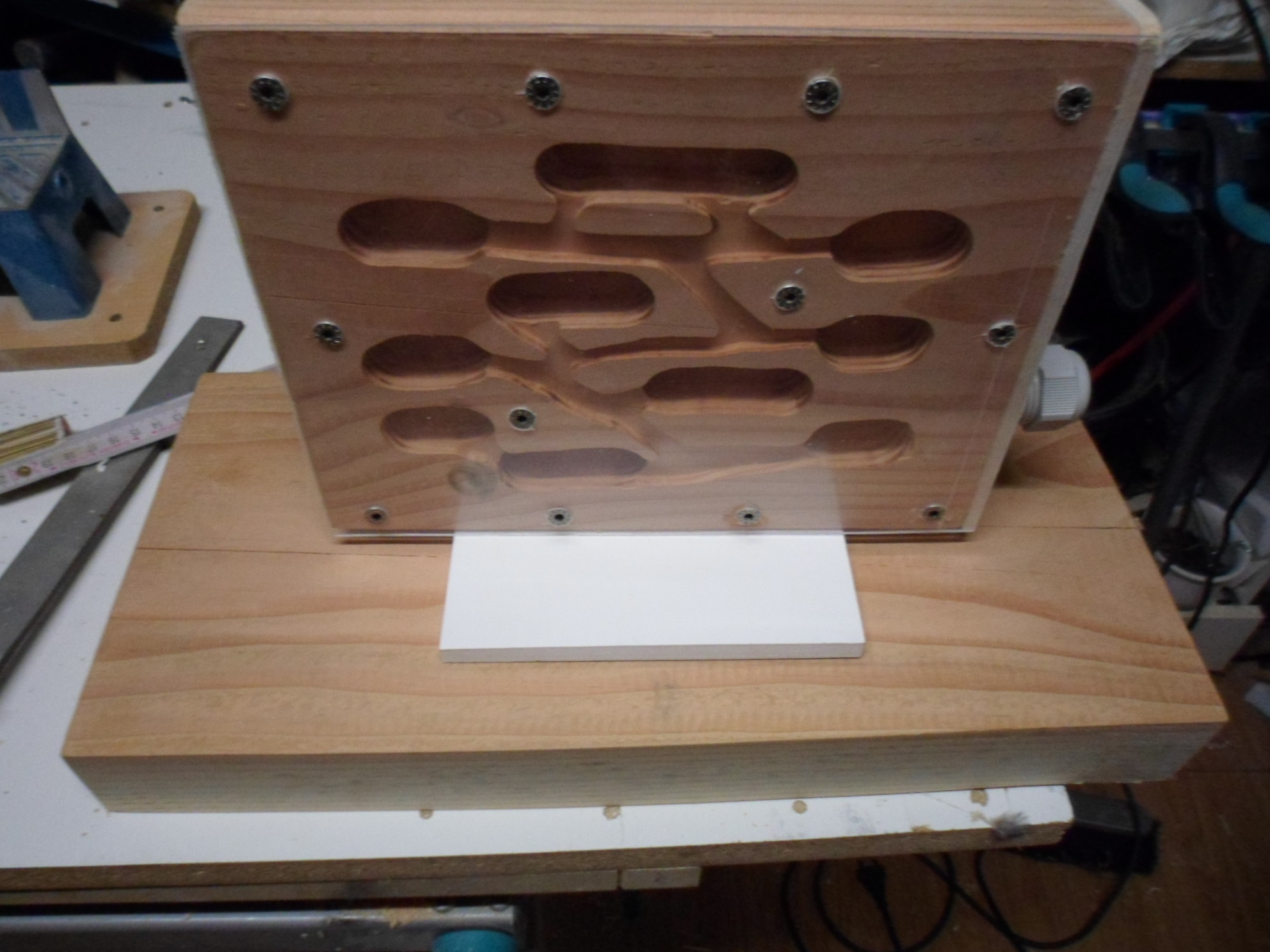 Die Kammern sind gefräst, nun müssen noch die Gänge her. Oben und unten ist der Holzklotz hohl gefräst um Druck auf die Kanten zu vermeiden bei Dehnung (Wasser Zugabe). Weiterhin sind in der Mitte durchgehende Belüftungsbohrungen um das Klima zu regeln mit eine Lüfter damit kein Schimmel entsteht.