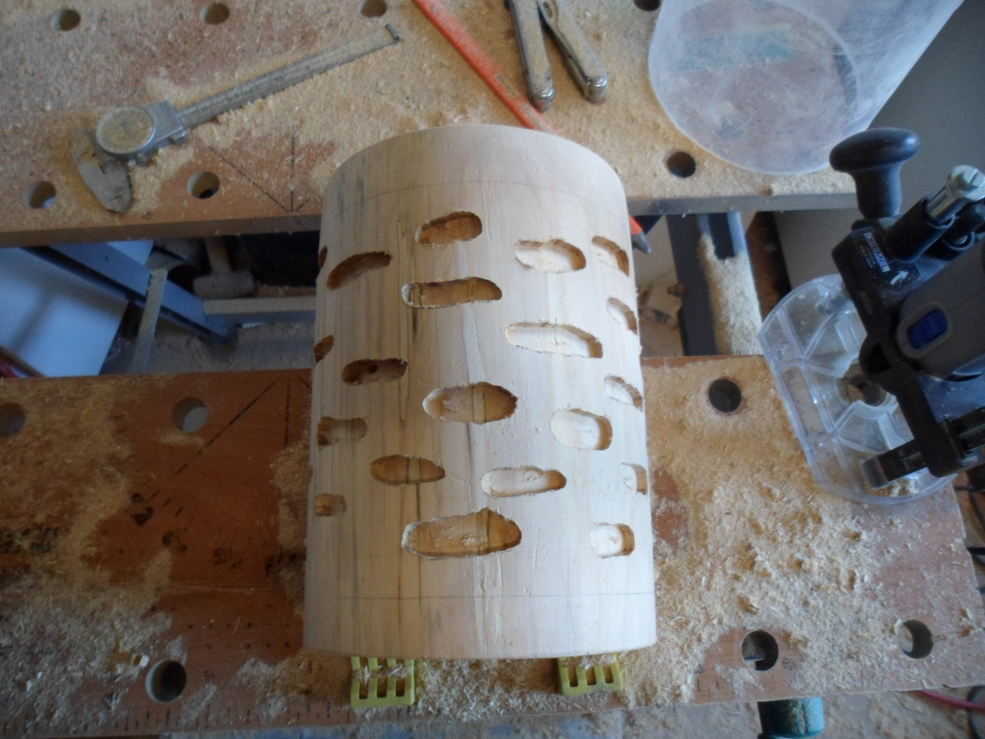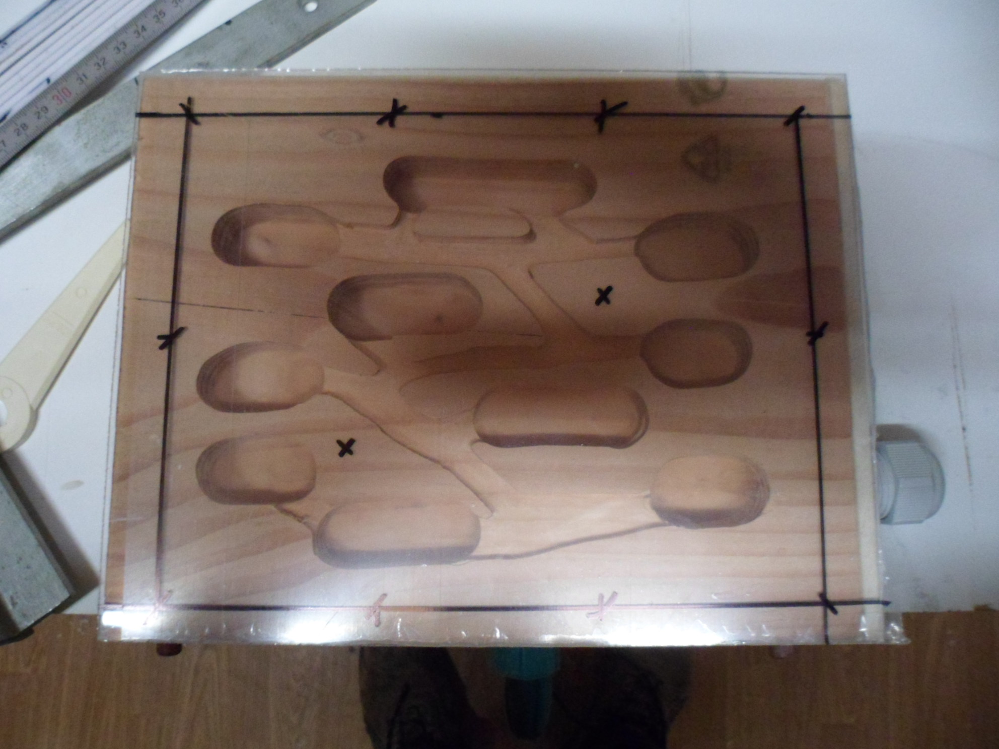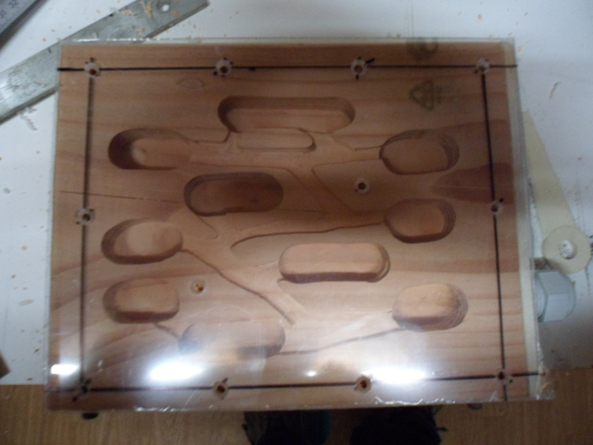 Die Kammern sind gefräst, nun müssen noch die Gänge her. Oben und unten ist der Holzklotz hohl gefräst um Druck auf die Kanten zu vermeiden bei Dehnung (Wasser Zugabe). Weiterhin sind in der Mitte durchgehende Belüftungsbohrungen um das Klima zu regeln mit eine Lüfter damit kein Schimmel entsteht.