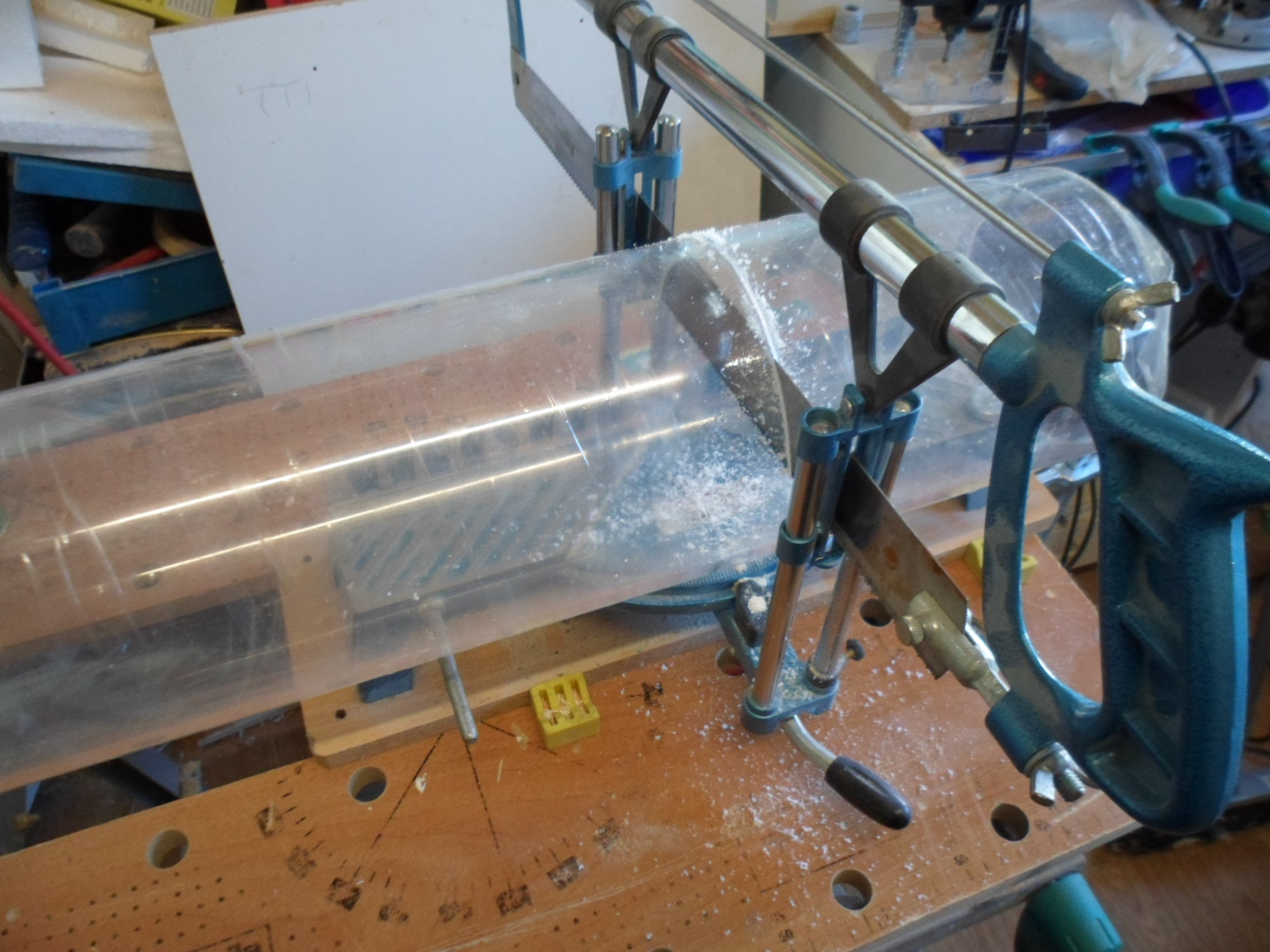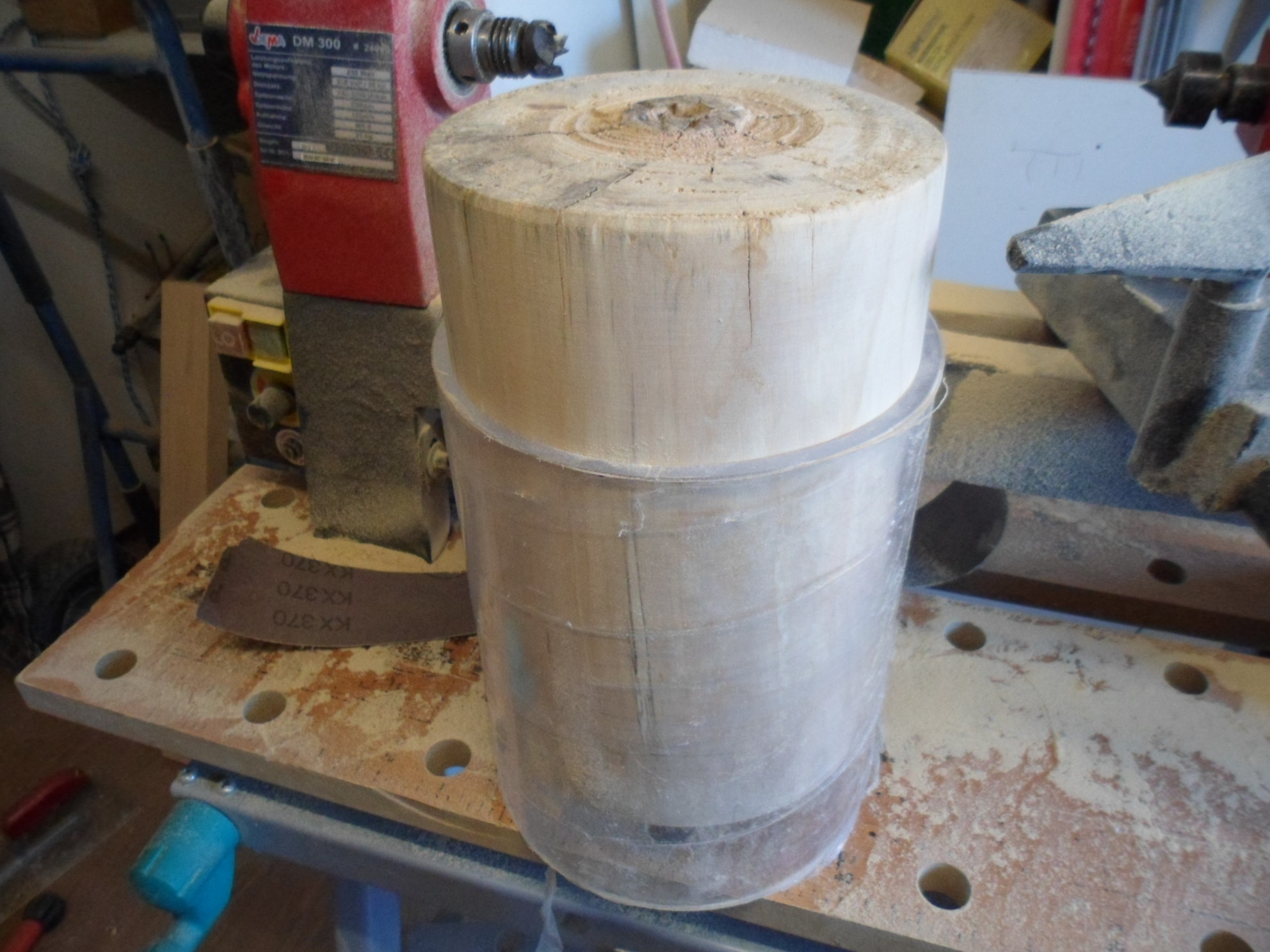 Hatte kein passendes Holz da also musste der Brennholz stapel leiden und ich hab mir eine Birke gegriffen. Das Acrylglasrohr hab ich auf 20 cm gekürzt mit einer popeligen Säge. Wichtig dabei ist mit wenig Druck zu sägen und nach Möglichkeit ein Schneid öl verwenden. Dadurch wird der Schnitt ziemlich Winkel gerecht. Das drechseln war ein Akt mit der Drechselbank, einfach Baumarkt Mist :fluchen: