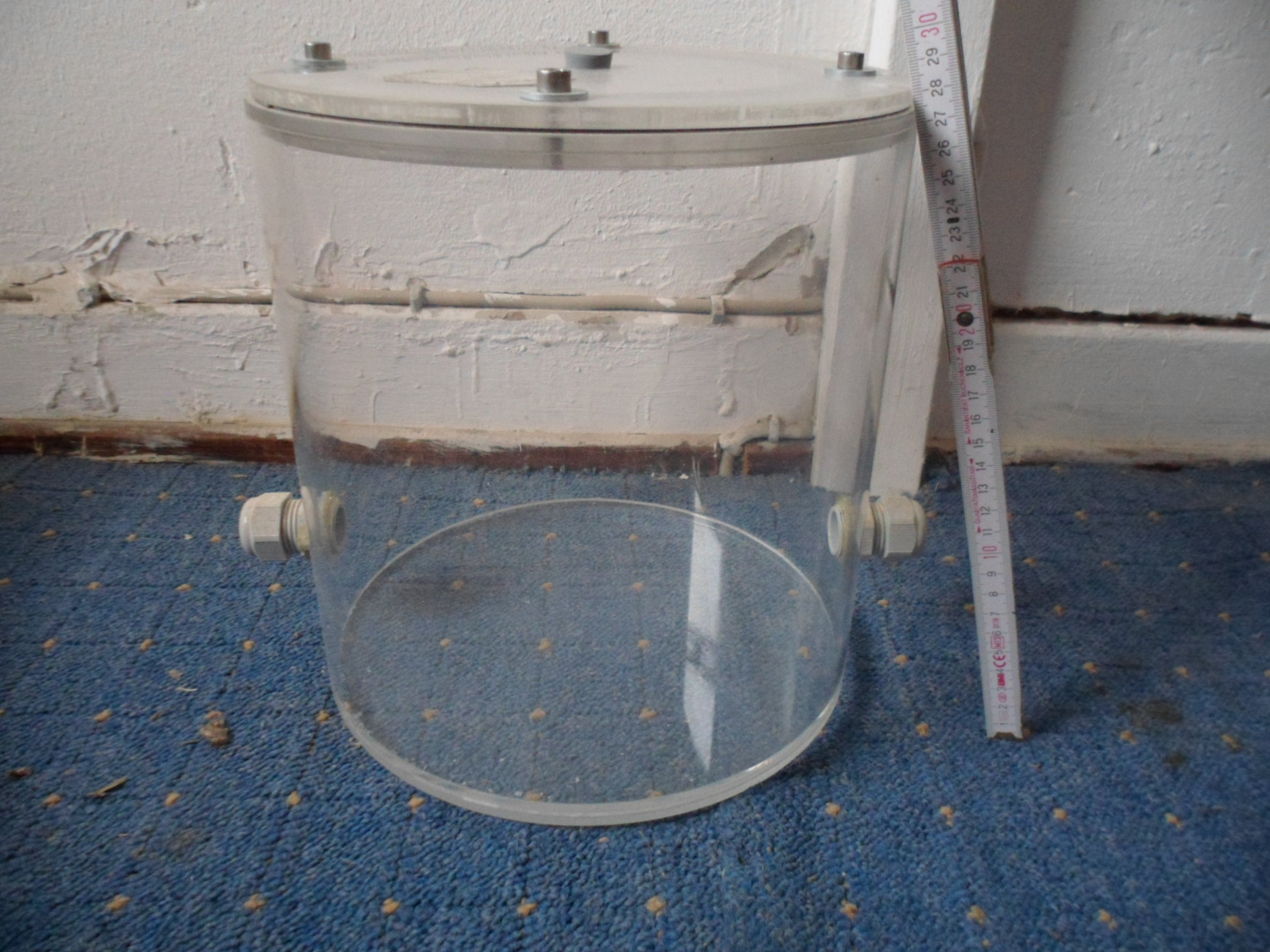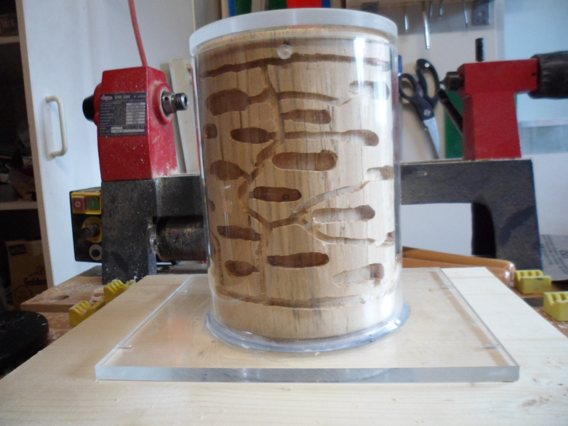 Die Plexiglasröhre hat 5 mm Wandung, da kommt das Holz an seine Grenzen mit der Berstkraft. Ich bin alter Terrarianer, hier liegt soviel Technik rum aus alten Zeiten das ich mir da keine Gedanken mache. Das Klima kann gesteuert werden über Thermometer Hygrometer Schalteinheit, oben im Deckel wird ein Lüfter integriert der Kondenswasser vermeidet. Unten kommen noch Belüftungsbohrungen hinein. Auch wollen Crematogaster scutellaris es lieber trocken.