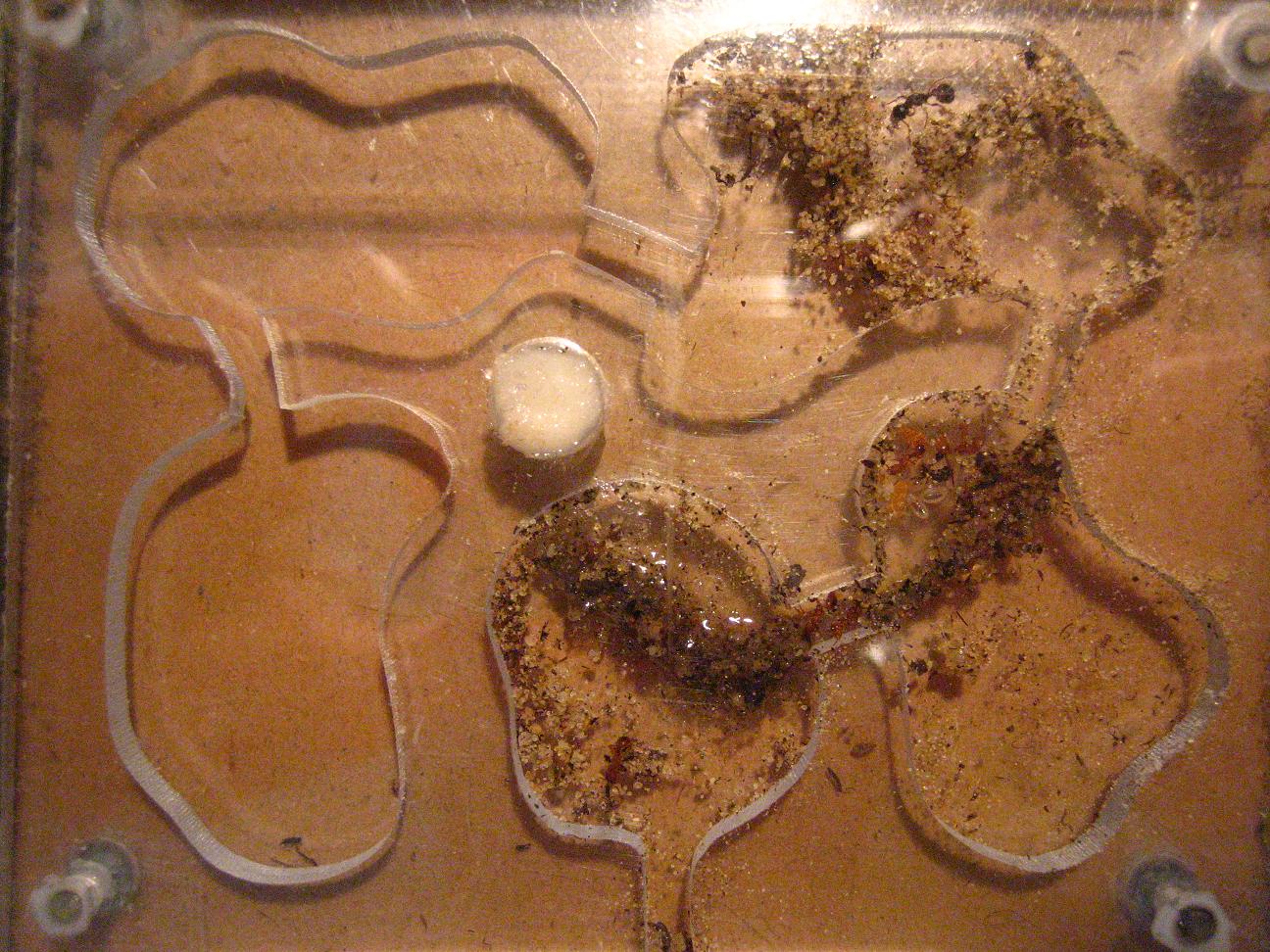 2.) die Nester versiffen binnen weniger Wochen ekelhaft! Wie ihr wisst koten die Gyne und auch die Arbeiterinnen schon mal ins Nest. Normalerweise (Ytong, Erde) sickert der Kot ab und verteilt sich. Im Kunstglasnest jedoch sickert und trocknet gar nichts, und es bildet sich eine ekelhafte Schlammschicht im Nest. Ist genug Kot vorhanden, beginnt sich ein gelblicher Niederschlag an den Scheiben zu bilden... kondensierte GĂĽlle?